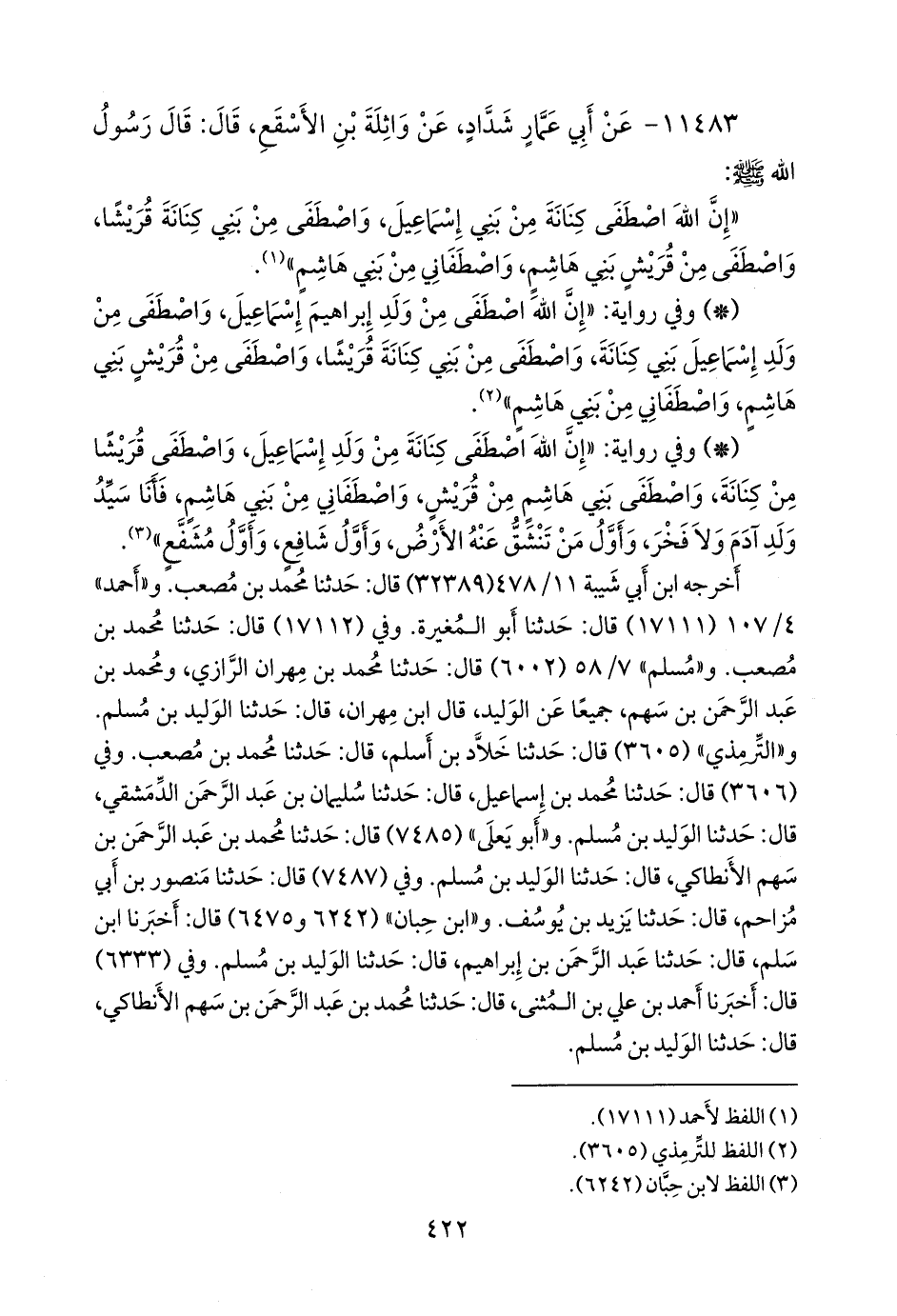 - وفي رواية: «إن الله اصطفى من ولد إبراهيم إسماعيل، واصطفى من ولد إسماعيل بني كنانة، واصطفى من بني كنانة قريشا، واصطفى من قريش بني هاشم، واصطفاني من بني هاشم» (¬٢).