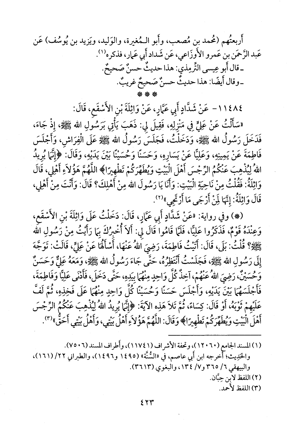 - وفي رواية: «عن شداد أبي عمار، قال: دخلت على واثلة بن الأسقع، وعنده قوم، فذكروا عليا، فلما قاموا قال لي: ألا أخبرك بما رأيت من رسول الله صَلى الله عَليه وسَلم؟ قلت: بلى، قال: أتيت فاطمة، رضي الله عنها، أسألها عن علي، قالت: توجه إلى رسول الله صَلى الله عَليه وسَلم فجلست أنتظره، حتى جاء رسول الله صَلى الله عَليه وسَلم ومعه علي وحسن وحسين، رضي الله عنهم، آخذ كل واحد منهما بيده، حتى دخل، فأدنى عليا وفاطمة، فأجلسهما بين يديه، وأجلس حسنا وحسينا كل واحد منهما على فخذه، ثم لف عليهم ثوبه، أو قال: كساء، ثم تلا هذه الآية: {إنما يريد الله ليذهب عنكم الرجس أهل البيت ويطهركم تطهيرا} وقال: اللهم هؤلاء أهل بيتي، وأهل بيتي أحق» (¬٢).