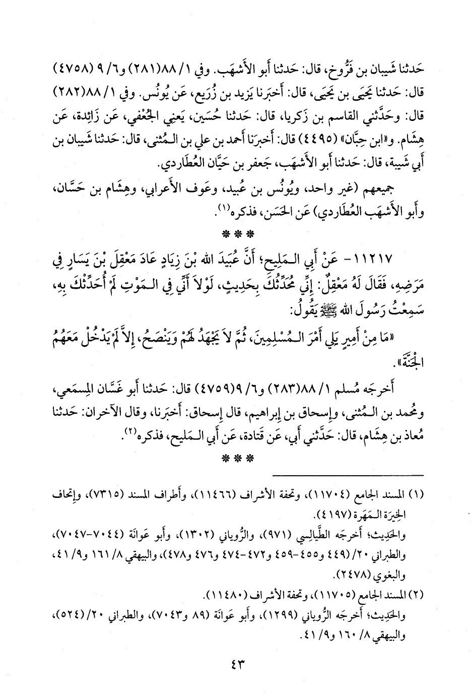 ١١٢١٧ - عن أبي المليح؛ أن عُبيد الله بن زياد عاد معقل بن يسار في مرضه، فقال له معقل: إني محدثك بحديث، لولا أني في الموت لم أحدثك به، سمعت رسول الله صَلى الله عَليه وسَلم يقول: