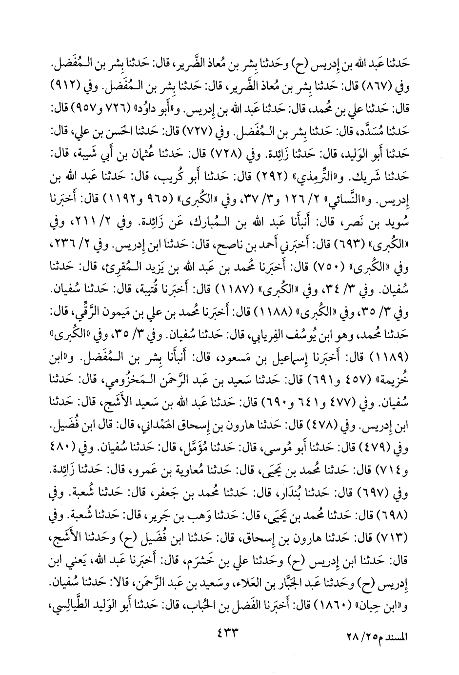 وفي (٧١٣) قال: حدثنا هارون بن إسحاق، قال: حدثنا ابن فضيل (ح) وحدثنا الأشج، قال: حدثنا ابن إدريس (ح) وحدثنا علي بن خَشرَم، قال: أخبرنا عبد الله، يعني ابن إدريس (ح) وحدثنا عبد الجبار بن العلاء، وسعيد بن عبد الرَّحمَن، قالا: حدثنا سفيان. و «ابن حِبَّان» (١٨٦٠) قال: أخبرنا الفضل بن الحُبَاب، قال: حدثنا أَبو الوليد الطيالسي،