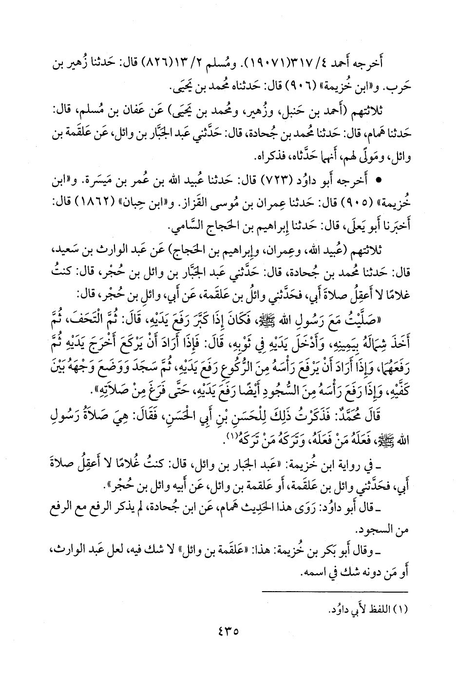 - في رواية ابن خزيمة: «عبد الجبار بن وائل، قال: كنت غلاما لا أعقل صلاة أبي, فحدثني وائل بن علقمة، أو علقمة بن وائل، عن أبيه وائل بن حُجْر».