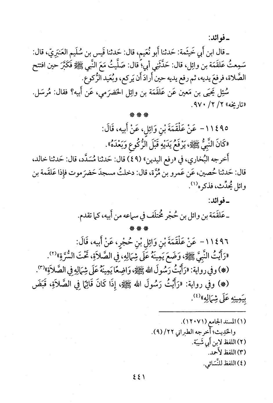 - قال ابن أبي خيثمة: حدثنا أَبو نُعيم، قال: حدثنا قيس بن سليم العنبري، قال: سمعت علقمة بن وائل، قال: حدثني أبي؛ قال: صليت مع النبي صَلى الله عَليه وسَلم فكبر حين افتتح الصلاة، فرفع يديه، ثم رفع يديه حين أراد أن يركع، وبعيد الركوع.