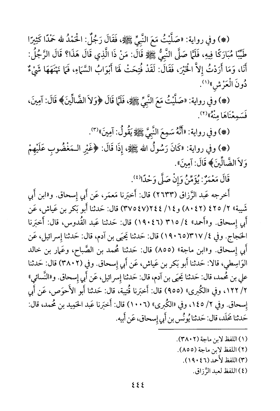 أخرجه عبد الرزاق (٢٦٣٣) قال: أخبرنا معمر، عن أبي إسحاق. و «ابن أبي شيبة» (٨٠٤٢) و ١٤/ ٢٤٤ (٣٧٥٤٧) قال: حدثنا أَبو بكر بن عياش، عن أبي إسحاق. و «أحمد» ٤/ ٣١٥ (١٩٠٤٦) قال: حدثنا عبد القدوس، قال: أخبرنا الحجاج. وفي ٤/ ٣١٧ (١٩٠٦٥) قال: حدثنا يحيى بن آدم، قال: حدثنا إسرائيل، عن أبي إسحاق. و «ابن ماجة» (٨٥٥) قال: حدثنا محمد بن الصباح، وعمار بن خالد الواسطي، قالا: حدثنا أَبو بكر بن عياش، عن أبي إسحاق. وفي (٣٨٠٢) قال: حدثنا علي بن محمد، قال: حدثنا يحيى بن آدم، قال: حدثنا إسرائيل، عن أبي إسحاق. و «النَّسَائي» ٢/ ١٢٢، وفي «الكبرى» (٩٥٥) قال: أخبرنا قتيبة، قال: حدثنا أَبو الأحوص، عن أبي إسحاق. وفي ٢/ ١٤٥، وفي «الكبرى» (١٠٠٦) قال: أخبرنا عبد الحميد بن محمد، قال: حدثنا مخلد، قال: حدثنا يونس بن أبي إسحاق، عن أبيه.