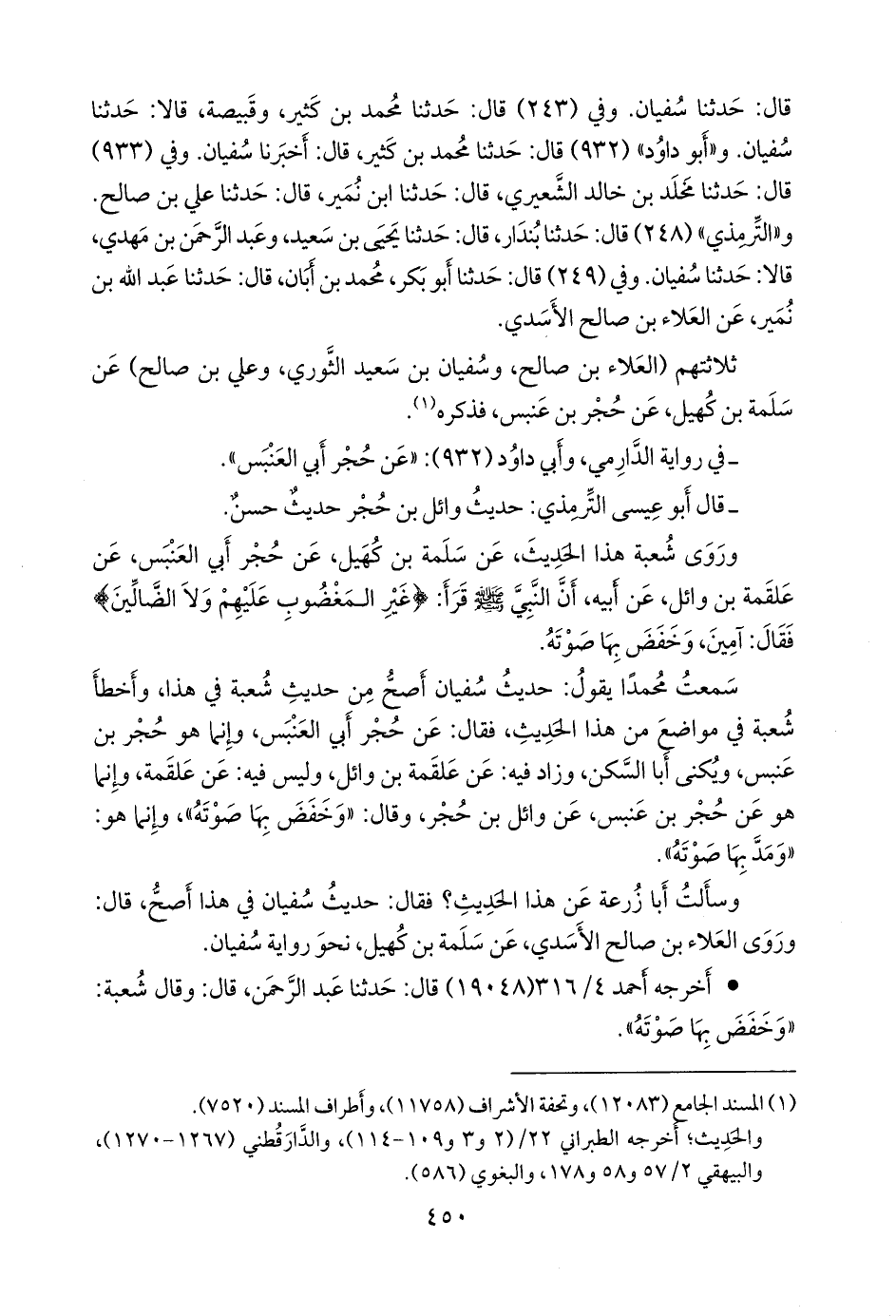 وفي (٢٤٣) قال: حدثنا محمد بن كثير، وقَبيصَة، قالا: حدثنا سفيان. و «أَبو داود» (٩٣٢) قال: حدثنا محمد بن كثير، قال: أخبرنا سفيان. وفي (٩٣٣) قال: حدثنا مخلد بن خالد الشعيري، قال: حدثنا ابن نُمير، قال: حدثنا علي بن صالح. و «التِّرمِذي» (٢٤٨) قال: حدثنا بُندَار، قال: حدثنا يحيى بن سعيد، وعبد الرَّحمَن بن مهدي، قالا: حدثنا سفيان. وفي (٢٤٩) قال: حدثنا أَبو بكر، محمد بن أبان، قال: حدثنا عبد الله بن نُمير، عن العلاء بن صالح الأسدي.