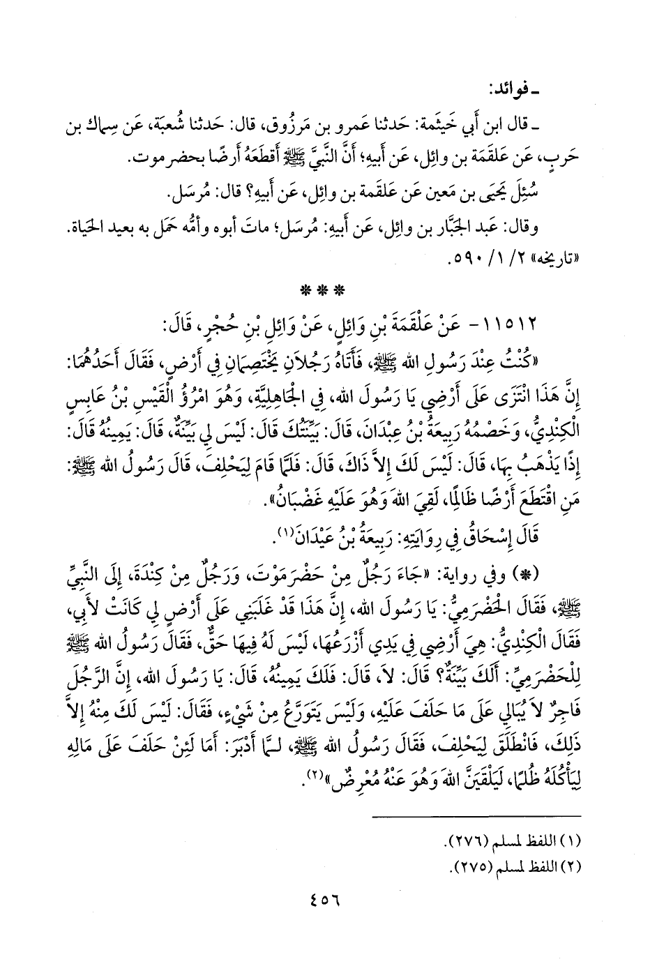 «كنت عند رسول الله صَلى الله عَليه وسَلم فأتاه رجلان يختصمان في أرض، فقال أحدهما: إن هذا انتزى على أرضي يا رسول الله، في الجاهلية، وهو امرؤ القيس بن عابس الكندي، وخصمه ربيعة بن عبدان، قال: بينتك قال: ليس لي بينة، قال: يمينه قال: إذا يذهب بها، قال: ليس لك إلا ذاك، قال: فلما قام ليحلف، قال رسول الله صَلى الله عَليه وسَلم: من اقتطع أرضا ظالما، لقي الله وهو عليه غضبان».