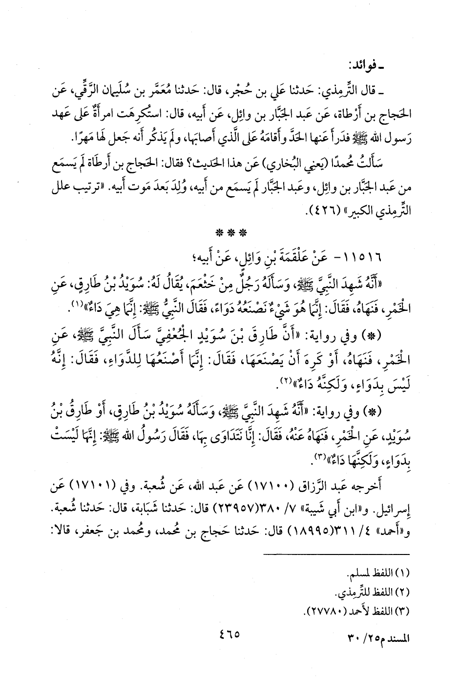 - وفي رواية: «أنه شهد النبي صَلى الله عَليه وسَلم وسأله سويد بن طارق، أو طارق بن سويد، عن الخمر، فنهاه عنه، فقال: إنا نتداوى بها، فقال رسول الله صَلى الله عَليه وسَلم: إنها ليست بدواء، ولكنها داء» (¬٣).
