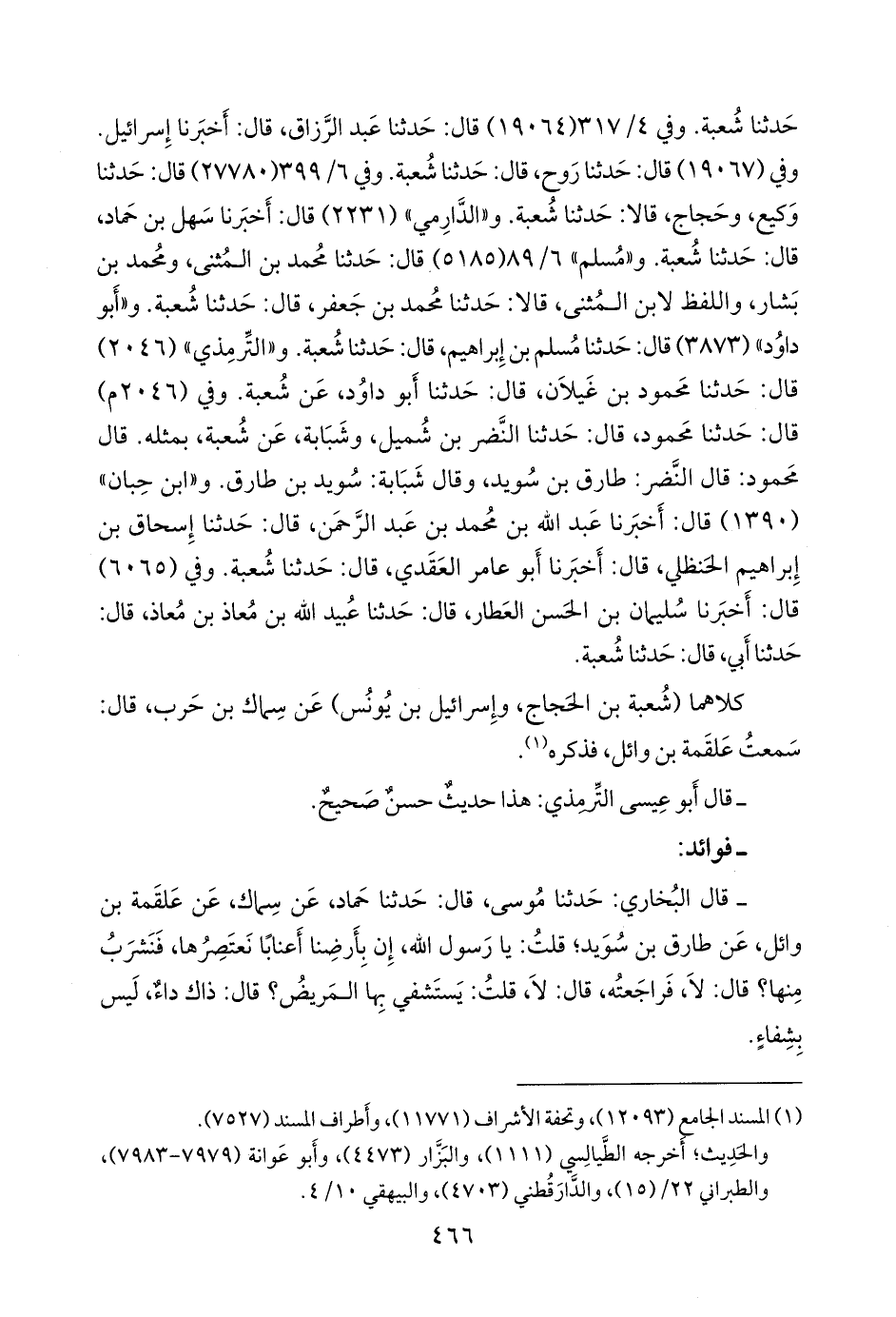 وفي ٦/ ٣٩٩ (٢٧٧٨٠) قال: حدثنا وكيع، وحجاج، قالا: حدثنا شعبة. و «الدَّارِمي» (٢٢٣١) قال: أخبرنا سهل بن حماد، قال: حدثنا شعبة. و «مسلم» ٦/ ٨٩ (٥١٨٥) قال: حدثنا محمد بن المثنى، ومحمد بن بشار، واللفظ لابن المثنى، قالا: حدثنا محمد بن جعفر، قال: حدثنا شعبة. و «أَبو داود» (٣٨٧٣) قال: حدثنا مسلم بن إبراهيم، قال: حدثنا شعبة. و «التِّرمِذي» (٢٠٤٦) قال: حدثنا محمود بن غَيلان، قال: حدثنا أَبو داود، عن شعبة. وفي (٢٠٤٦ م) قال: حدثنا محمود، قال: حدثنا النضر بن شميل، وشَبَابة، عن شعبة، بمثله. قال محمود: قال النضر: طارق بن سويد، وقال شَبَابة: سويد بن طارق. و «ابن حِبَّان» (١٣٩٠) قال: أخبرنا عبد الله بن محمد بن عبد الرَّحمَن، قال: حدثنا إسحاق بن إبراهيم الحنظلي، قال: أخبرنا أَبو عامر العَقَدي، قال: حدثنا شعبة. وفي (٦٠٦٥) قال: أخبرنا سليمان بن الحسن العطار، قال: حدثنا عُبيد الله بن معاذ بن معاذ، قال: حدثنا أبي، قال: حدثنا شعبة.