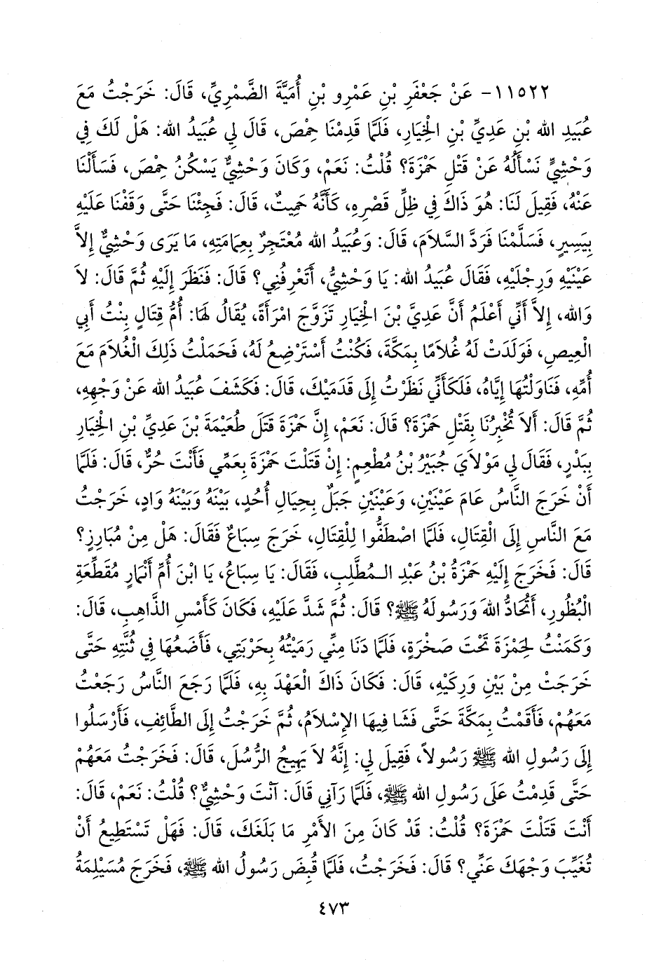 ١١٥٢٢ - عن جعفر بن عَمرو بن أُمية الضمري، قال: خرجت مع عُبيد الله بن عَدي بن الخيار، فلما قدمنا حمص، قال لي عُبيد الله: هل لك في وحشي نسأله عن قتل حمزة؟ قلت: نعم، وكان وحشي يسكن حمص، فسألنا عنه، فقيل لنا: هو ذاك في ظل قصره، كأنه حميت، قال: فجئنا حتى وقفنا عليه بيسير، فسلمنا فرد السلام، قال: وعُبيد الله معتجر بعمامته، ما يرى وحشي إلا عينيه ورجليه، فقال عُبيد الله: يا وحشي، أتعرفني؟ قال: فنظر إليه ثم قال: لا والله، إلا أني أعلم أن عَدي بن الخيار تزوج امرأة، يقال لها: أم قتال بنت أبي العيص، فولدت له غلاما بمكة، فكنت أسترضع له، فحملت ذلك الغلام مع أمه، فناولتها إياه، فلكأني نظرت إلى قدميك، قال: فكشف عُبيد الله عن وجهه، ثم قال: ألا تخبرنا بقتل حمزة؟ قال: نعم، إن حمزة قتل طعيمة بن عَدي بن الخيار ببدر، فقال لي مولاي جبير بن مطعم: إن قتلت حمزة بعمي فأنت حر، قال: فلما أن خرج الناس عام عينين، وعينين جبل بحيال أحد، بينه وبينه واد، خرجت مع الناس إلى القتال، فلما اصطفوا للقتال، خرج سباع فقال: هل من مبارز؟ قال: فخرج إليه حمزة بن عبد المطلب، فقال: يا سباع، يا ابن أم أنمار مقطعة البظور، أتحاد الله ورسوله صَلى الله عَليه وسَلم؟ قال: ثم شد عليه، فكان كأمس الذاهب، قال: وكمنت لحمزة تحت صخرة، فلما دنا مني رميته بحربتي، فأضعها في ثنته حتى خرجت من بين وركيه، قال: فكان ذاك العهد به، فلما رجع الناس رجعت معهم، فأقمت بمكة حتى فشا فيها الإسلام، ثم خرجت إلى الطائف، فأرسلوا إلى رسول الله صَلى الله عَليه وسَلم رسولا، فقيل لي: إنه لا يهيج الرسل، قال: فخرجت معهم حتى قدمت على رسول الله صَلى الله عَليه وسَلم فلما رآني قال: آنت وحشي؟ قلت: نعم، قال: أنت قتلت حمزة؟ قلت: قد كان من الأمر ما بلغك، قال: فهل تستطيع أن تغيب وجهك عني؟ قال: فخرجت، فلما قبض رسول الله صَلى الله عَليه وسَلم فخرج مسيلمة