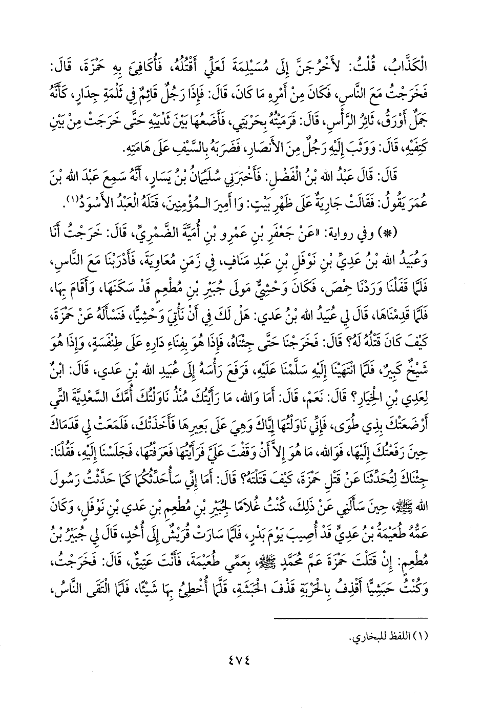 - وفي رواية: «عن جعفر بن عَمرو بن أُمية الضمري، قال: خرجت أنا وعُبيد الله بن عَدي بن نوفل بن عبد مناف، في زمن معاوية، فأدربنا مع الناس، فلما قفلنا وردنا حمص، فكان وحشي مولى جبير بن مطعم قد سكنها، وأقام بها، فلما قدمناها، قال لي عُبيد الله بن عَدي: هل لك في أن نأتي وحشيا، فنسأله عن حمزة، كيف كان قتله له؟ قال: فخرجنا حتى جئناه، فإذا هو بفناء داره على طنفسة، وإذا هو شيخ كبير، فلما انتهينا إليه سلمنا عليه، فرفع رأسه إلى عُبيد الله بن عَدي، قال: ابن لعَدي بن الخيار؟ قال: نعم، قال: أما والله، ما رأيتك منذ ناولتك أمك السعدية التي أرضعتك بذي طوى، فإني ناولتها إياك وهي على بعيرها فأخذتك، فلمعت لي قدماك حين رفعتك إليها، فوالله، ما هو إلا أن وقفت علي فرأيتها فعرفتها، فجلسنا إليه، فقلنا: جئناك لتحدثنا عن قتل حمزة، كيف قتلته؟ قال: أما إني سأحدثكما كما حدثت رسول الله صَلى الله عَليه وسَلم حين سألني عن ذلك، كنت غلاما لجبير بن مطعم بن عَدي بن نوفل، وكان عمه طعيمة بن عَدي قد أصيب يوم بدر، فلما سارت قريش إلى أحد، قال لي جبير بن مطعم: إن قتلت حمزة عم محمد صَلى الله عَليه وسَلم بعمي طعيمة، فأنت عتيق، قال: فخرجت، وكنت حبشيا أقذف بالحربة قذف الحبشة، قلما أخطئ بها شيئا، فلما التقى الناس،