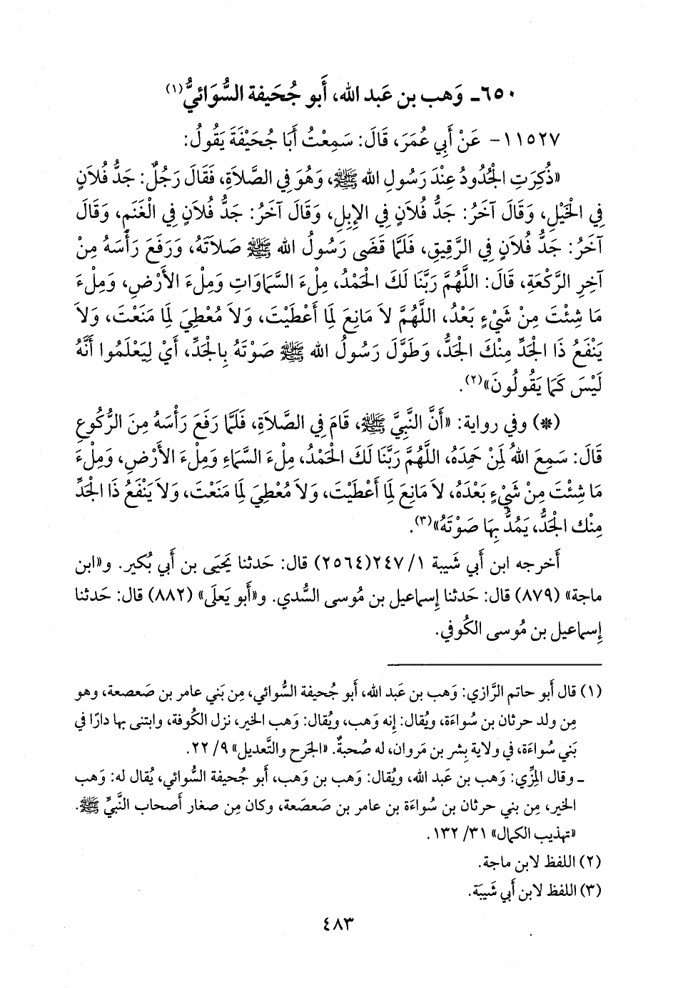 (¬١) قال أَبو حاتم الرازي: وهب بن عبد الله، أَبو جُحيفة السوائي، من بني عامر بن صعصعة، وهو من ولد حرثان بن سواءة، ويقال: إنه وهب، ويقال: وهب الخير، نزل الكوفة، وابتنى بها دارا في بني سواءة، في ولاية بشر بن مروان، له صحبة. «الجرح والتعديل» ٩/ ٢٢.
