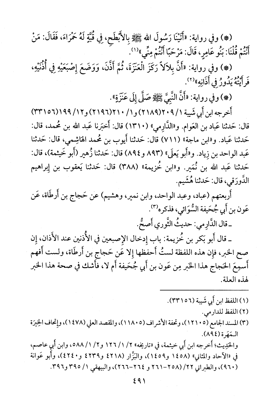 - قال ابن خزيمة: باب إدخال الإصبعين في الأذنين عند الأذان، إن صح الخبر، فإن هذه اللفظة لست أحفظها إلا عن حجاج بن أَرطَاة، ولست أفهم أسمع الحجاج هذا الخبر من عون بن أبي جُحيفة أم لا، فأشك في صحة هذا الخبر لهذه العلة.