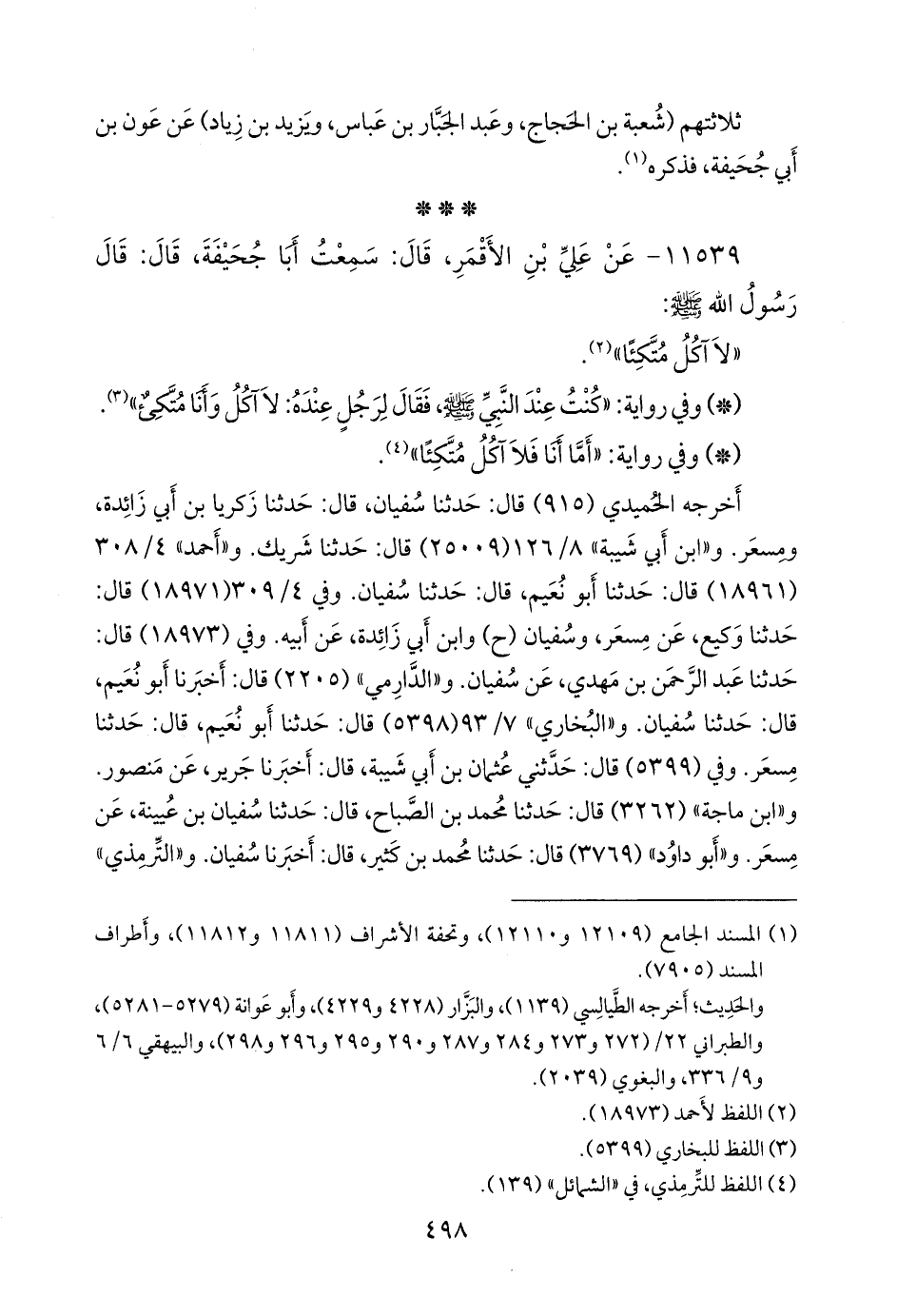 أخرجه الحُميدي (٩١٥) قال: حدثنا سفيان، قال: حدثنا زكريا بن أبي زائدة، ومسعر. و «ابن أبي شيبة» (٢٥٠٠٩) قال: حدثنا شَريك. و «أحمد» ٤/ ٣٠٨ (١٨٩٦١) قال: حدثنا أَبو نُعيم، قال: حدثنا سفيان. وفي ٤/ ٣٠٩ (١٨٩٧١) قال: حدثنا وكيع، عن مِسعَر، وسفيان (ح) وابن أبي زائدة، عن أبيه. وفي (١٨٩٧٣) قال: حدثنا عبد الرَّحمَن بن مهدي، عن سفيان. و «الدَّارِمي» (٢٢٠٥) قال: أخبرنا أَبو نُعيم، قال: حدثنا سفيان. و «البخاري» ٧/ ٩٣ (٥٣٩٨) قال: حدثنا أَبو نُعيم، قال: حدثنا مسعر. وفي (٥٣٩٩) قال: حدثني عثمان بن أبي شيبة، قال: أخبرنا جرير، عن منصور. و «ابن ماجة» (٣٢٦٢) قال: حدثنا محمد بن الصباح، قال: حدثنا سفيان بن عُيينة، عن مِسعَر. و «أَبو داود» (٣٧٦٩) قال: حدثنا محمد بن كثير، قال: أخبرنا سفيان.