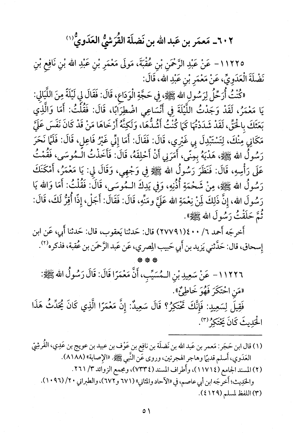 (¬١) قال ابن حجر: معمر بن عبد الله بن نضلة بن نافع بن عوف بن عبيد بن عويج بن عَدي، القرشي العدوي، أسلم قديما وهاجر الهجرتين، وروى عن النبي صَلى الله عَليه وسَلم. «الإصابة» (٨١٨٨).