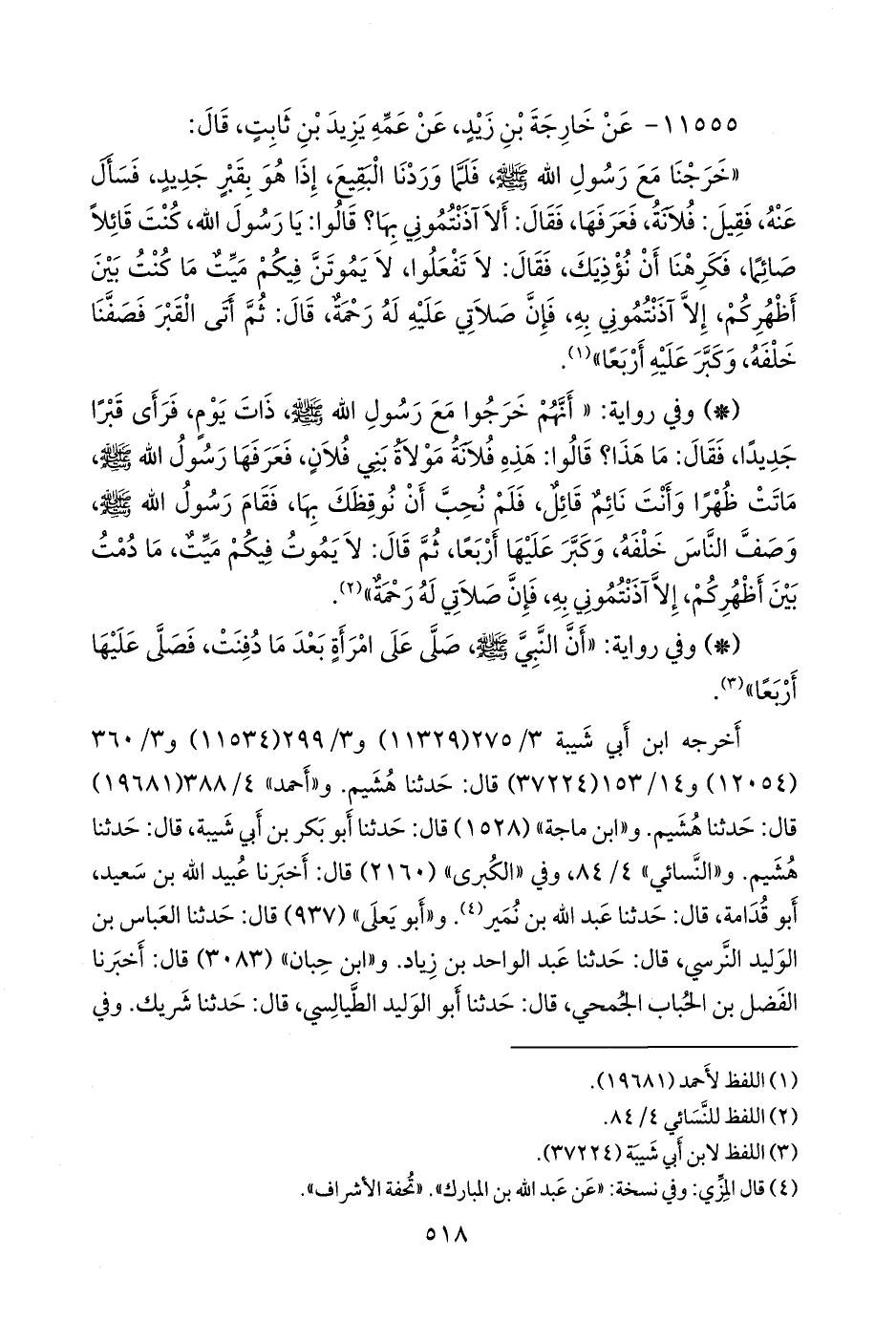 أربعتهم (هُشيم، وعبد الله بن نُمير، وعبد الواحد بن زياد، وشريك) عن عثمان بن حكيم بن عباد بن حنيف الأَنصاري، قال: حدثنا خارجة بن زيد بن ثابت، فذكره (¬٢).