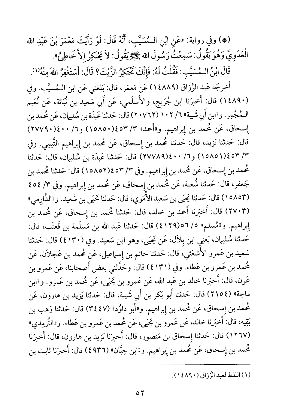 خمستُهم (مَن بَلَّغ مَعمَرًا، ونُعيم المُجمِر، ومحمد بن إِبراهيم، ويحيى بن سعيد الأَنصاري، ومحمد بن عَمرو) عن سعيد بن المُسَيب، فذكره (¬١).