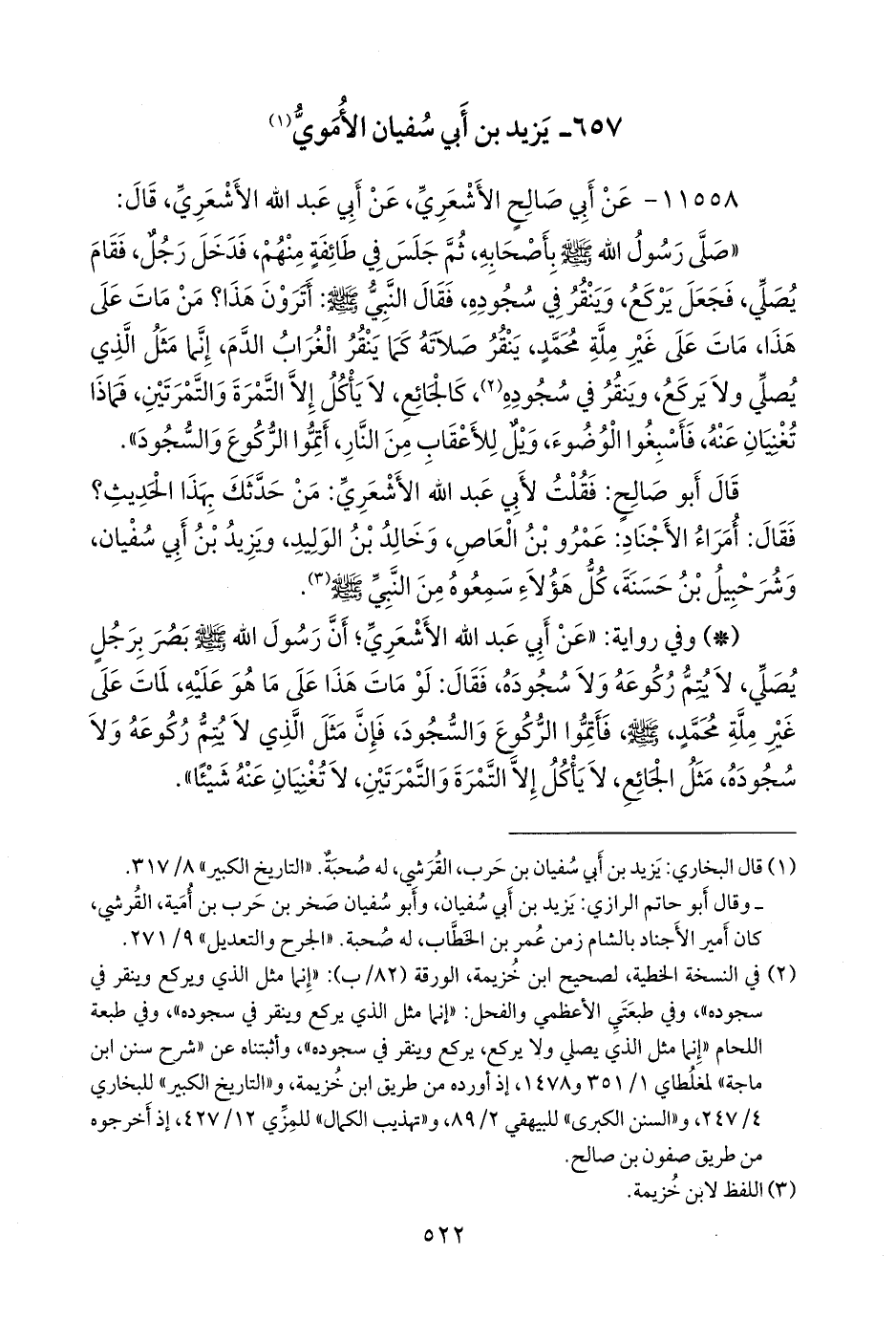 - وفي رواية: «عن أبي عبد الله الأشعري؛ أن رسول الله صَلى الله عَليه وسَلم بصر برجل يصلي، لا يتم ركوعه ولا سجوده، فقال: لو مات هذا على ما هو عليه، لمات على غير ملة محمد، صَلى الله عَليه وسَلم فأتموا الركوع والسجود، فإن مثل الذي لا يتم ركوعه ولا سجوده، مثل الجائع، لا يأكل إلا التمرة والتمرتين، لا تغنيان عنه شيئا».