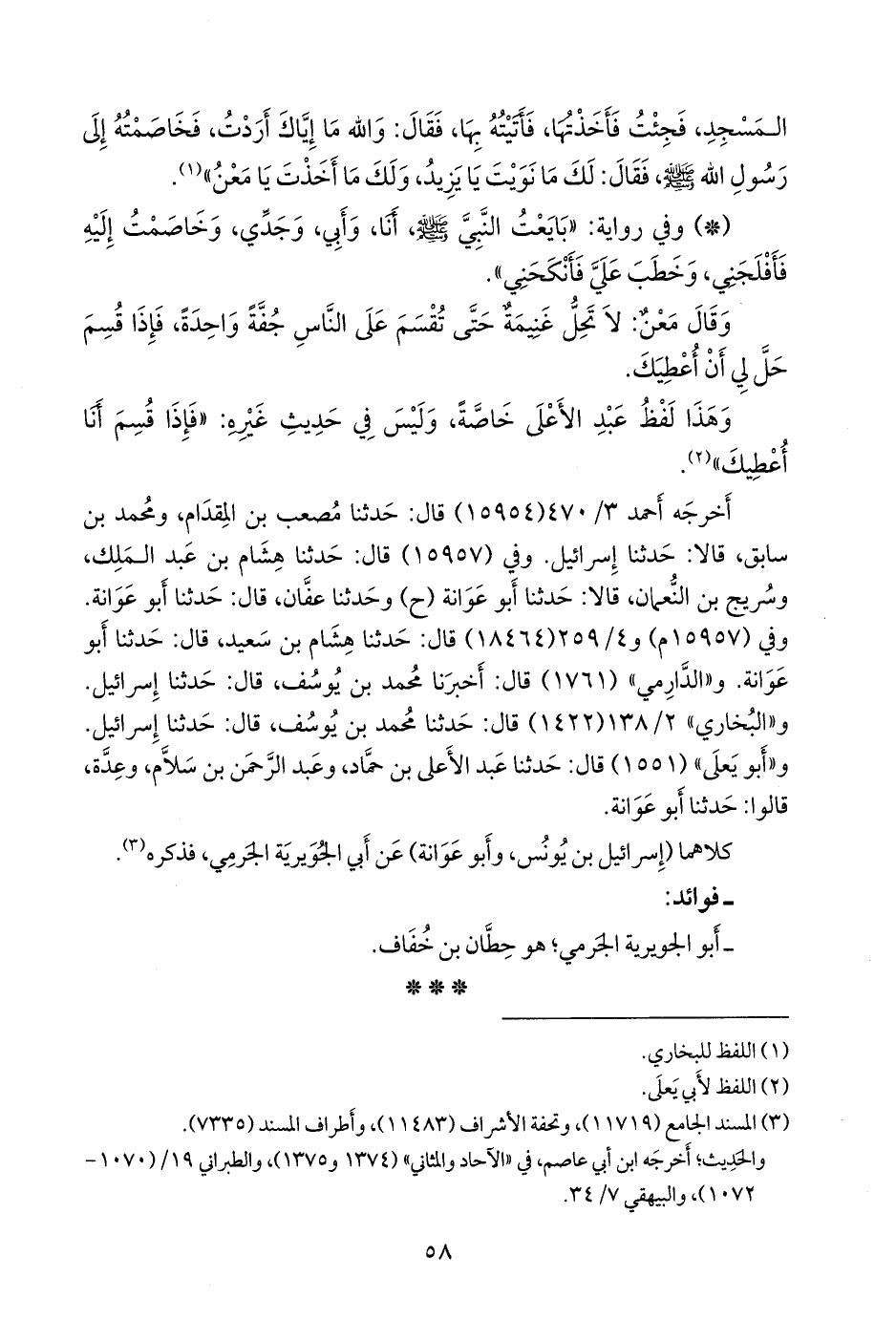 أخرجه أحمد (١٥٩٥٤) قال: حدثنا مصعب بن المقدام، ومحمد بن سابق، قالا: حدثنا إسرائيل. وفي (١٥٩٥٧) قال: حدثنا هشام بن عبد الملك، وسريج بن النعمان، قالا: حدثنا أَبو عَوانة (ح) وحدثنا عفان، قال: حدثنا أَبو عَوانة. وفي (١٥٩٥٧ م) و ٤/ ٢٥٩ (١٨٤٦٤) قال: حدثنا هشام بن سعيد، قال: حدثنا أَبو عَوانة. و «الدَّارِمي» (١٧٦١) قال: أخبرنا محمد بن يوسف، قال: حدثنا إسرائيل. و «البخاري» ٢/ ١٣٨ (١٤٢٢) قال: حدثنا محمد بن يوسف، قال: حدثنا إسرائيل. و «أَبو يَعلى» (١٥٥١) قال: حدثنا عبد الأعلى بن حماد، وعبد الرَّحمَن بن سلام، وعدة، قالوا: حدثنا أَبو عَوانة.