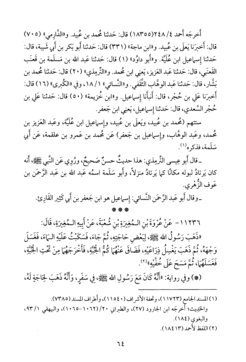 و «أَبو داود» (١) قال: حدثنا عبد الله بن مَسلَمة بن قعنب القَعنَبي، قال: حدثنا عبد العزيز، يعني ابن محمد. و «التِّرمِذي» (٢٠) قال: حدثنا محمد بن بشار، قال: حدثنا عبد الوَهَّاب الثقفي. و «النَّسَائي» ١/ ١٨، وفي «الكبرى» (١٦) قال: أخبرنا علي بن حُجْر، قال: أنبأنا إسماعيل. و «ابن خزيمة» (٥٠) قال: حدثنا علي بن حُجْر السعدي، قال: حدثنا إسماعيل، يعني ابن جعفر.