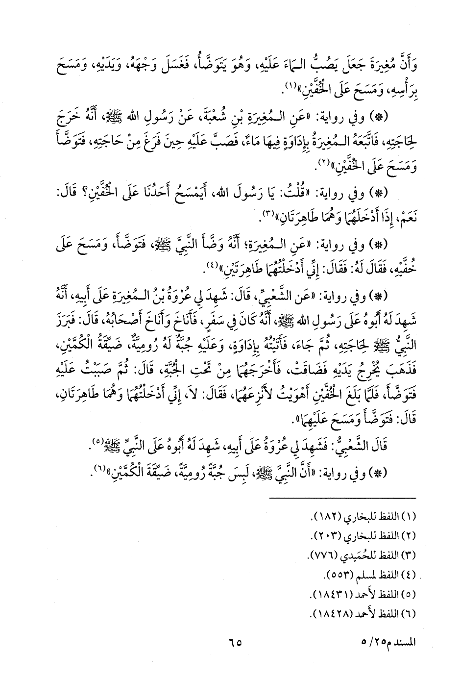 - وفي رواية: «عن الشعبي، قال: شهد لي عروة بن المغيرة على أبيه، أنه شهد له أَبوه على رسول الله صَلى الله عَليه وسَلم أنه كان في سفر، فأناخ وأناخ أصحابه، قال: فبرز النبي صَلى الله عَليه وسَلم لحاجته، ثم جاء، فأتيته بإداوة، وعليه جبة له رومية، ضيقة الكمين، فذهب يخرج يديه فضاقت، فأخرجهما من تحت الجبة، قال: ثم صببت عليه فتوضأ، فلما بلغ الخفين أهويت لأنزعهما، فقال: لا، إني أدخلتهما وهما طاهرتان، قال: فتوضأ ومسح عليهما».