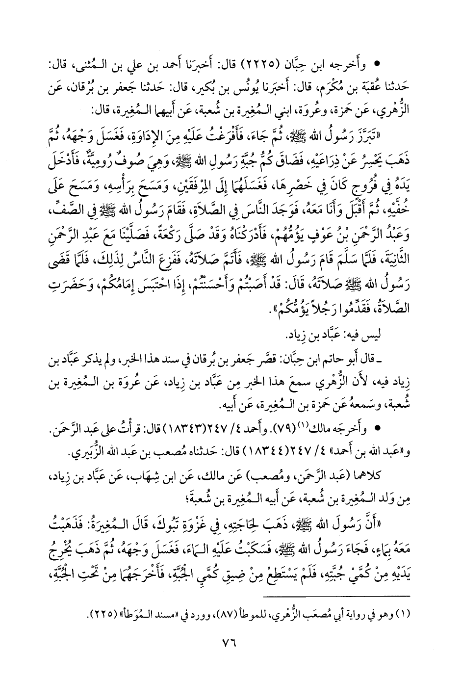 - قال أَبو حاتم بن حبان: قصر جعفر بن برقان في سند هذا الخبر، ولم يذكر عباد بن زياد فيه، لأن الزُّهْري سمع هذا الخبر من عباد بن زياد، عن عروة بن المغيرة بن شعبة، وسمعه عن حمزة بن المغيرة، عن أبيه.
