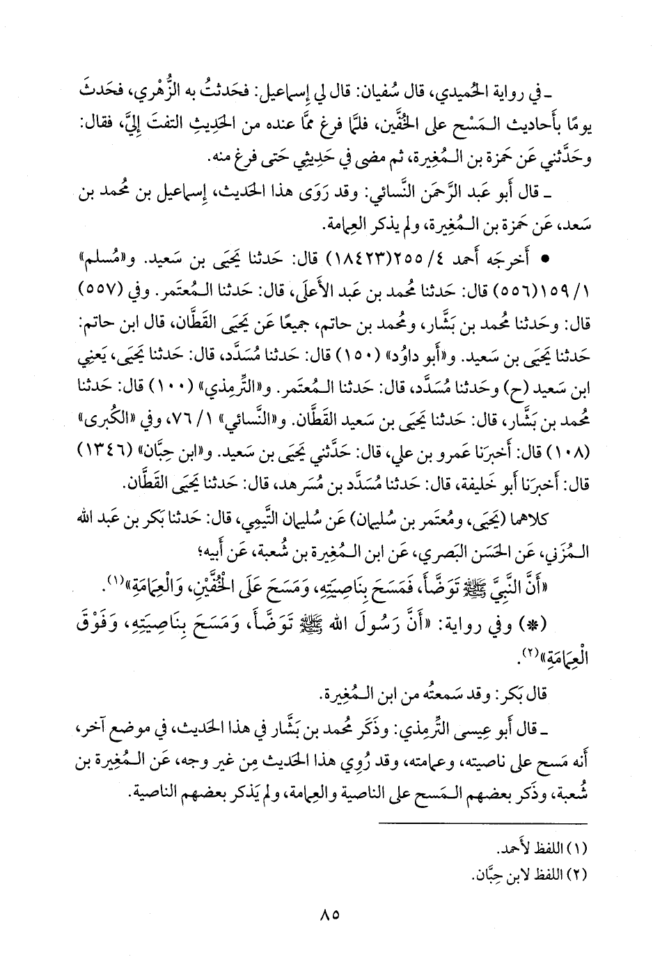 - قال التِّرمِذي: وذكر محمد بن بشار في هذا الحديث في موضع آخر، أَنه مَسح على ناصيته، وعمامته، وقد رُوي هذا الحديث من غير وجه، عن المغيرة بن شعبة، ذكر بعضهم المسح على الناصية والعِمامة، ولم يذكر بعضهم الناصية.
