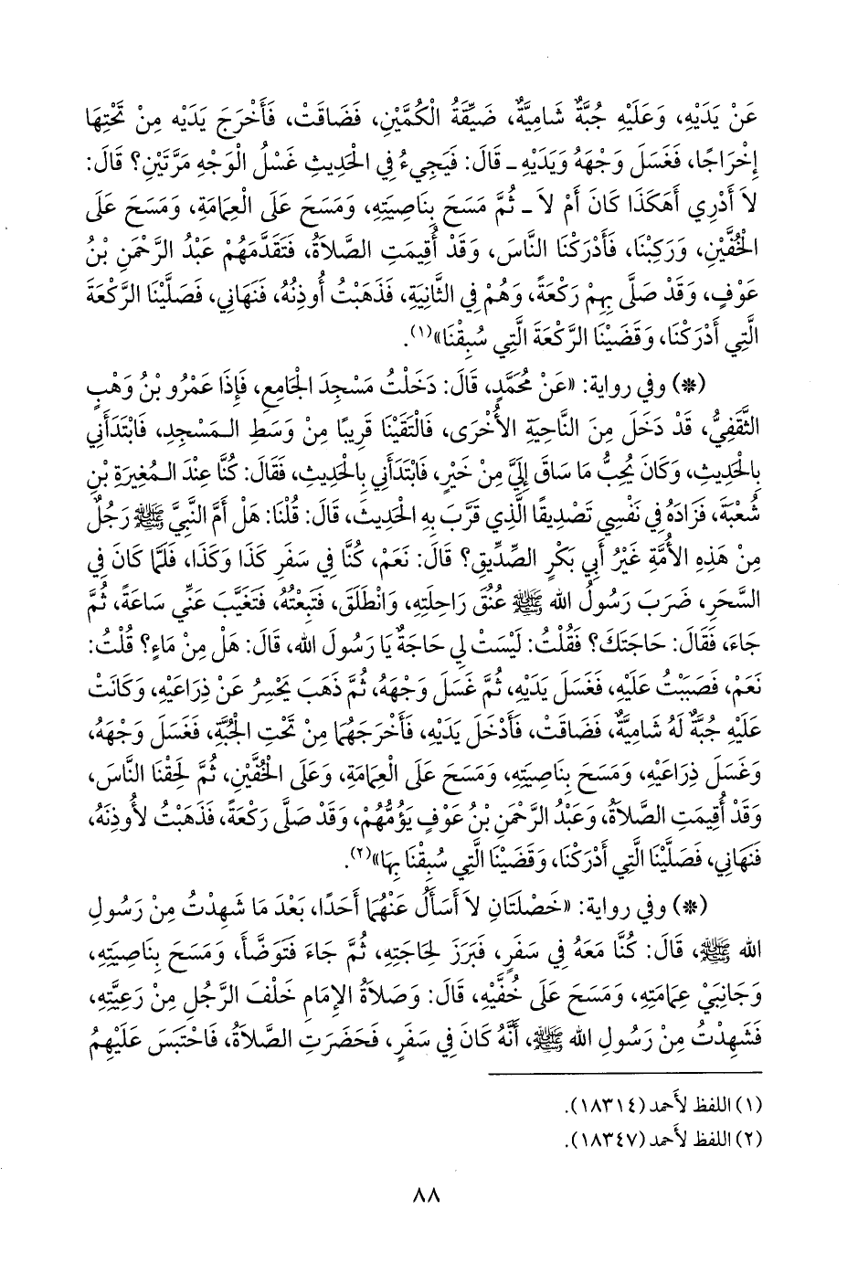 - وفي رواية: «خصلتان لا أسأل عنهما أحدا، بعد ما شهدت من رسول الله صَلى الله عَليه وسَلم قال: كنا معه في سفر، فبرز لحاجته، ثم جاء فتوضأ، ومسح بناصيته، وجانبي عمامته، ومسح على خفيه، قال: وصلاة الإمام خلف الرجل من رعيته، فشهدت من رسول الله صَلى الله عَليه وسَلم أنه كان في سفر، فحضرت الصلاة، فاحتبس عليهم