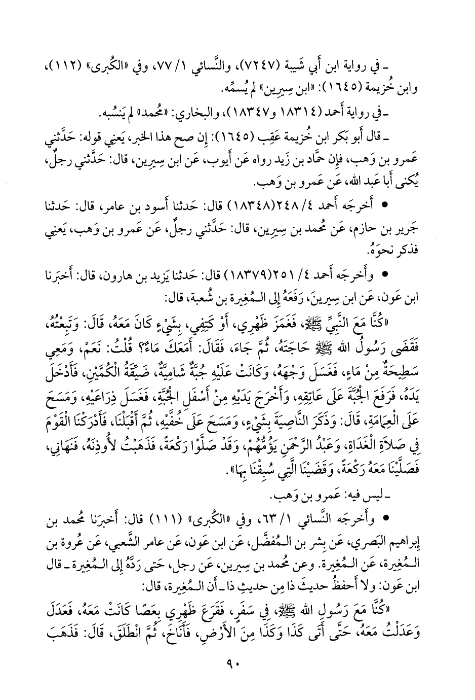 • وأخرجه النَّسَائي ١/ ٦٣، وفي «الكبرى» (١١١) قال: أخبرنا محمد بن إبراهيم البصري، عن بشر بن المُفَضَّل، عن ابن عَون، عن عامر الشعبي، عن عروة بن المغيرة، عن المغيرة. وعن محمد بن سِيرين، عن رجل، حتى رده إلى المغيرة ـ قال ابن عَون: ولا أحفظ حديث ذا من حديث ذا ـ أن المغيرة، قال: