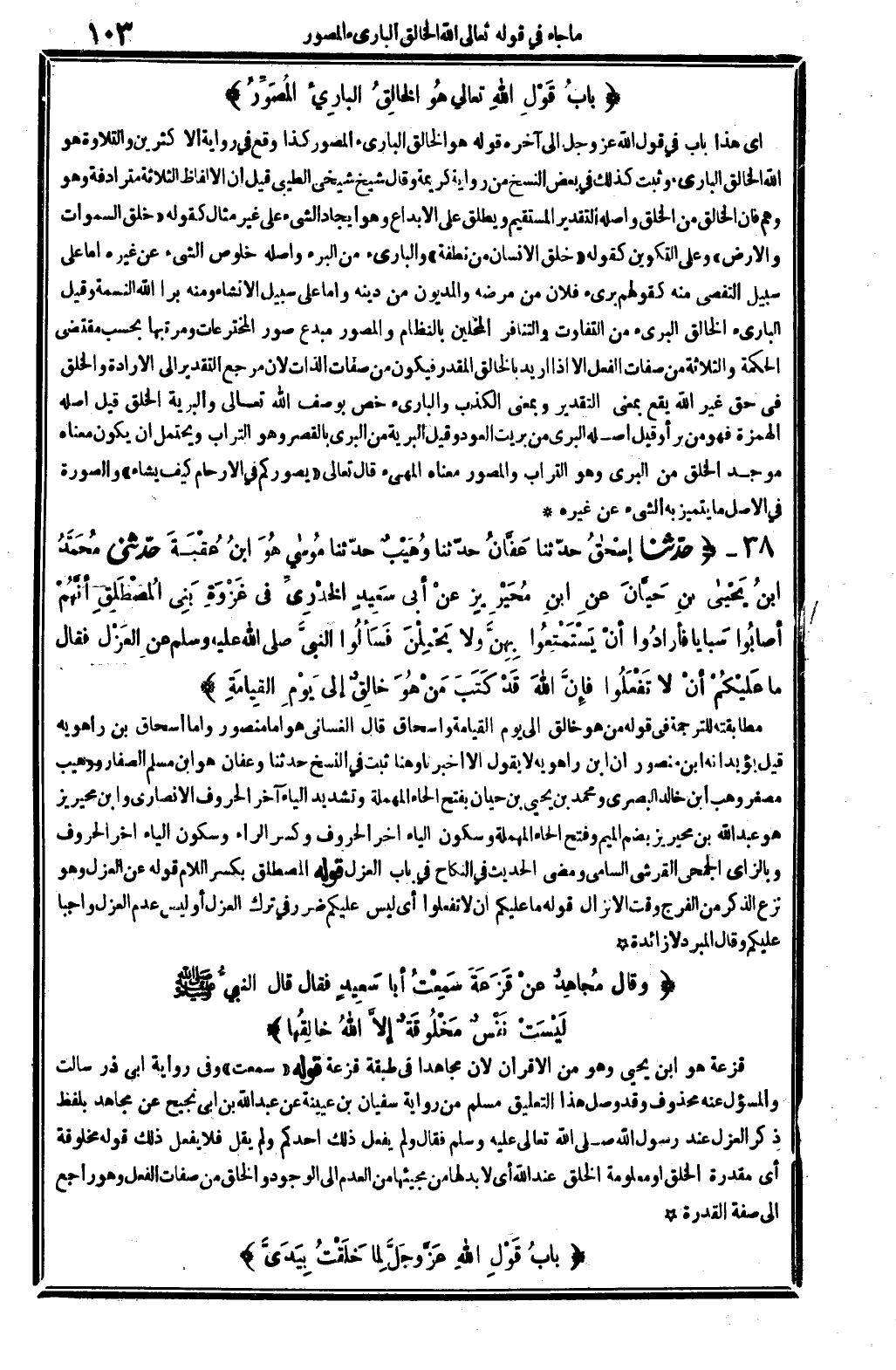 أَي: هَذَا بَاب فِي قَول الله عز وَجل ... إِلَى آخِره. قَوْله: {هُوَ اللَّهُ الْخَالِقُ الْبَارِىءُ الْمُصَوِّرُ لَهُ الاَْسْمَآءُ الْحُسْنَى يُسَبِّحُ لَهُ مَا فِى السَّمَاوَاتِ وَالاَْرْضِ وَهُوَ الْعَزِيزُ الْحَكِيمُ} كَذَا وَقع فِي رِوَايَة الْأَكْثَرين، والتلاوة: {هُوَ اللَّهُ الْخَالِقُ الْبَارِىءُ الْمُصَوِّرُ لَهُ الاَْسْمَآءُ الْحُسْنَى يُسَبِّحُ لَهُ مَا فِى السَّمَاوَاتِ وَالاَْرْضِ وَهُوَ الْعَزِيزُ الْحَكِيمُ} وَثَبت كَذَلِك فِي بعض النّسخ من رِوَايَة كَرِيمَة، وَقَالَ شيخ شَيْخي الطَّيِّبِيّ: قيل: إِن الْأَلْفَاظ الثَّلَاثَة مترادفة، وَهُوَ وهم، فَإِن الْخَالِق من الْخلق وَأَصله: التَّقْدِير الْمُسْتَقيم، وَيُطلق على الإبداع وَهُوَ إِيجَاد الشَّيْء على غير مِثَال. كَقَوْلِه: {خَلَقَ السَّمَاوَاتِ وَالاَْرْضَ بِالْحَقِّ تَعَالَى عَمَّا يُشْرِكُونَ} وعَلى التكوين كَقَوْلِه: {خَلَقَ الإِنْسَانَ مِن نُّطْفَةٍ فَإِذَا هُوَ خَصِيمٌ مُّبِينٌ} والبارىء من الْبُرْء وَأَصله خلوص الشَّيْء عَن غَيره إِمَّا على سَبِيل التفصي مِنْهُ كَقَوْلِهِم: برىء فلَان من مَرضه والمديون من دينه، وَإِمَّا على سَبِيل الْإِنْشَاء وَمِنْه برأَ الله النَّسمَة. وَقيل: البارىء الْخَالِق البرىء من التَّفَاوُت والتنافر المخلين بالنظام، والمصور مبدع صور المخترعات ومرتبها بِحَسب مُقْتَضى الْحِكْمَة وَالثَّلَاثَة من صِفَات الْفِعْل إلاَّ إِذا أُرِيد بالخالق الْمُقدر فَيكون من صِفَات الذَّات، لِأَن مرجع التَّقْدِير إِلَى الْإِرَادَة والخلق فِي حق غير الله يَقع بِمَعْنى التَّقْدِير، وَبِمَعْنى: الْكَذِب، والبارىء خص بِوَصْف الله تَعَالَى والبرية الْخلق، قيل: أَصله الْهمزَة فَهُوَ من برأَ، وَقيل: أَصله الْبري من بريت الْعود، وَقيل: الْبَريَّة من البرى بِالْقصرِ وَهُوَ التُّرَاب، وَيحْتَمل أَن يكون مَعْنَاهُ موحد الْخلق من الْبري وَهُوَ التُّرَاب، والمصور مَعْنَاهُ المهيىء قَالَ تَعَالَى: {هُوَ الَّذِي يُصَوِّرُكُمْ فِي الاَْرْحَامِ كَيْفَ يَشَآءُ لاَ إِلَاهَ إِلاَّ هُوَ الْعَزِيزُ الْحَكِيمُ} وَالصُّورَة فِي الأَصْل مَا يتَمَيَّز بِهِ الشَّيْء عَن غَيره.