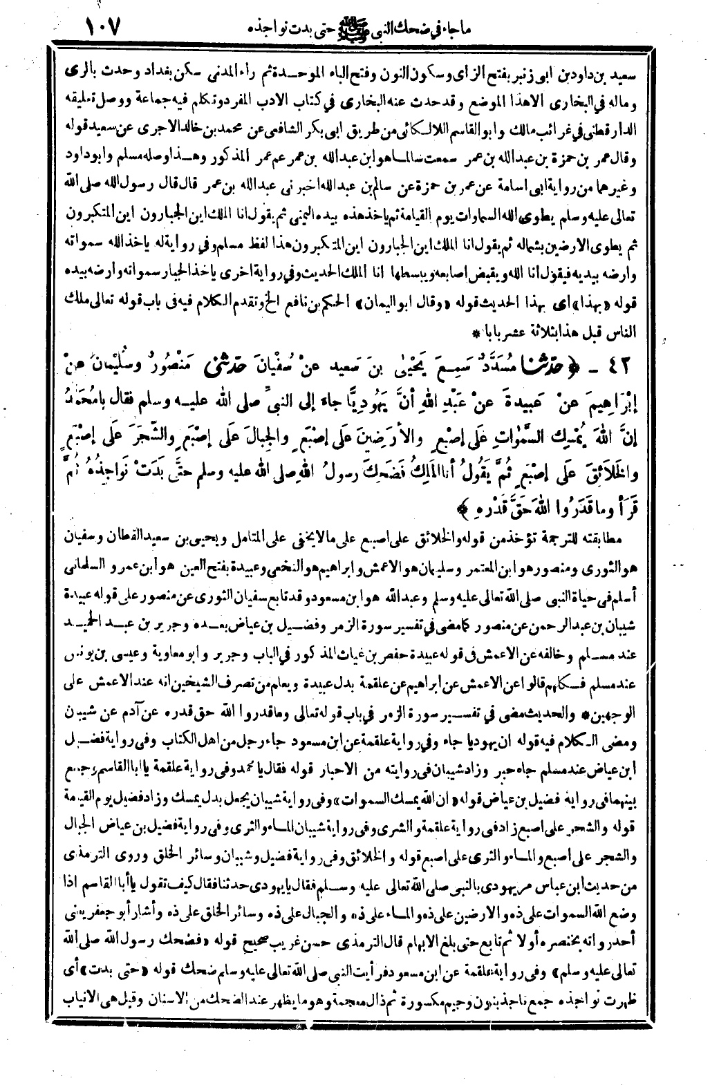 7414 - حدّثنا مُسَدَّدٌ، سَمِعَ يَحْياى بنَ سَعيد، عنْ سُفْيانَ حدّثني مَنْصُورٌ وسليْمانُ عنْ إبْرَاهِيمَ عَنْ عَبيدةَ عنْ عَبْدِ الله أنَّ يَهُودِيّاً جاءَ إِلَى النّبيِّ فَقَالَ: يَا مُحَمَّدُ إنَّ الله يُمْسِك السَّماوَاتِ عَلَى إصْبعِ والأرَضِينَ عَلى إصْبَعِ، والجِبالَ عَلى إصْبَعٍ والشَّجَرَ عَلى إصْبَعٍ والخَلاَئِقَ عَلى إصْبَعٍ، ثُمَّ يَقُولُ: أَنا المَلِكُ ... فَضَحِكَ رسولُ الله حتَّى بَدَتْ نَواجِذُهُ، ثُمَّ قَرَأ {وَمَا قدرُوا الله حق قدره} .