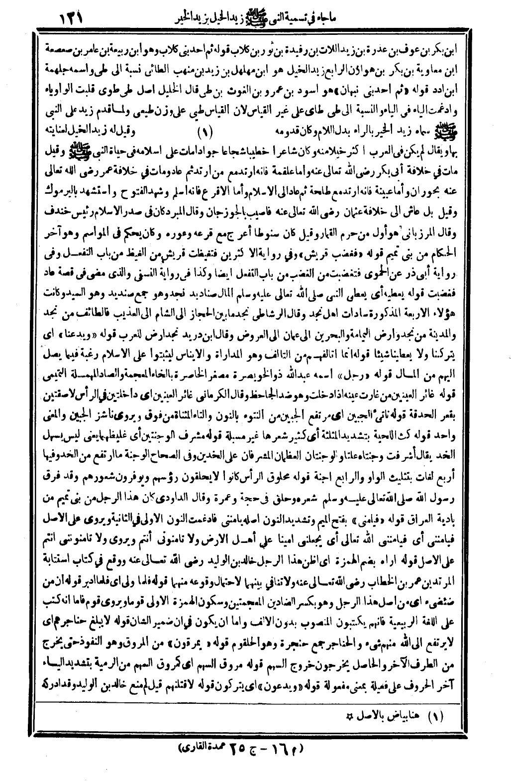 بن بكر بن عَوْف بن عذرة بن زيد اللات بن رفيدة بن ثَوْر بن كلاب. قَوْله: ثمَّ أحد بني كلاب وَهُوَ ابْن ربيعَة بن عَامر بن صعصعة بن مُعَاوِيَة بن بكر بن هوَازن. الرَّابِع: زيد الْخَيل هُوَ ابْن مهلهل بن زيد بن منْهب الطَّائِي نِسْبَة إِلَى طيىء واسْمه جلهمة بن ادد. قَوْله: ثمَّ أحد بني نَبهَان هُوَ أسود بن عَمْرو بن الْغَوْث بن طيىء، قَالَ الْخَلِيل: أصل طيىء طوى قلبت الْوَاو يَاء وأدغمت الْيَاء فِي الْيَاء وَالنِّسْبَة إِلَى طيىء طائي على غير الْقيَاس لِأَن الْقيَاس طيي على وزن طيعي، وَلما قدم زيد على النَّبِي سَمَّاهُ: زيد الْخَيْر، بالراء بدل اللَّام، وَكَانَ قدومه ... وَقيل لَهُ: زيد الْخَيل لعنايته بهَا، وَيُقَال: لم يكن فِي الْعَرَب أَكثر خيلاً مِنْهُ، وَكَانَ شَاعِرًا خَطِيبًا شجاعاً جواداً مَاتَ على إِسْلَامه فِي حَيَاة النَّبِي وَقيل: مَاتَ فِي خلَافَة أبي بكر، رَضِي الله تَعَالَى عَنهُ. وَأما عَلْقَمَة فَإِنَّهُ ارْتَدَّ مَعَ من ارْتَدَّ ثمَّ عَاد وَمَات فِي خلَافَة عمر، رَضِي الله تَعَالَى عَنهُ، بحوران، وَأما عُيَيْنَة فَإِنَّهُ ارْتَدَّ مَعَ طَلْحَة ثمَّ عَاد إِلَى الْإِسْلَام، وَأما الْأَقْرَع فَإِنَّهُ أسلم وَشهد الْفتُوح وَاسْتشْهدَ باليرموك، وَقيل: بل عَاشَ إِلَى خلَافَة عُثْمَان، رَضِي الله تَعَالَى عَنهُ، فأصيب بالجوزجان. وَقَالَ الْمبرد: كَانَ فِي صدر الْإِسْلَام رَئِيس خندف. وَقَالَ المرزباني: هُوَ أول من حرم الْقمَار، وَقيل: كَانَ سَنُوطا أعرج مَعَ قرعه وعوره وَكَانَ يحكم فِي المواسم وَهُوَ آخر الْحُكَّام من بني تَمِيم. قَوْله: فَغضِبت قُرَيْش وَفِي رِوَايَة الْأَكْثَرين: فتغيظت قُرَيْش، من الغيظ من بَاب التفعل، وَفِي رِوَايَة أبي ذَر عَن الْحَمَوِيّ: فتغضبت، من الْغَضَب من بَاب التفعل أَيْضا وَكَذَا فِي رِوَايَة النَّسَفِيّ، وَالَّذِي مضى فِي قصَّة عَاد: فَغضِبت، قَوْله: يُعْطِيهِ أَي: يُعْطي النَّبِي، المَال صَنَادِيد نجد وَهُوَ جمع صنديد وَهُوَ السَّيِّد، وَكَانَت هَؤُلَاءِ الْأَرْبَعَة الْمَذْكُورَة سَادَات أهل نجد، وَقَالَ الرشاطي: نجد مَا بَين الْحجاز إِلَى الشَّام إِلَى العذيب فالطائف من نجد وَالْمَدينَة من نجد وَأَرْض الْيَمَامَة والبحرين إِلَى عمان إِلَى الْعرُوض، وَقَالَ ابْن دُرَيْد: نجد أَرض للْعَرَب. قَوْله: ويدعنا أَي: يتركنا وَلَا يُعْطِينَا شَيْئا. قَوْله: إِنَّمَا أتألفهم من التألف وَهُوَ المداراة والإيناس ليثبتوا على الْإِسْلَام رَغْبَة فِيمَا يصل إِلَيْهِم من المَال. قَوْله: رجل اسْمه عبد الله ذُو الْخوَيْصِرَة مصغر الخاصرة بِالْخَاءِ الْمُعْجَمَة وَالصَّاد الْمُهْملَة التَّمِيمِي قَوْله: غائر الْعَينَيْنِ من غارت عينه إِذْ دخلت وَهُوَ ضد الجاحظ، وَقَالَ الْكرْمَانِي: غائر الْعَينَيْنِ أَي: داخلتين فِي الرَّأْس لاصقتين بقعر الحدقة. قَوْله: ناتىء الجبين أَي: مُرْتَفع الجبين من النتوء بالنُّون وَالتَّاء الْمُثَنَّاة من فَوق، ويروى: ناشز الجبين، وَالْمعْنَى وَاحِد. قَوْله: كث اللِّحْيَة بتَشْديد الْمُثَلَّثَة أَي: كثير شعرهَا غير مسبلة. قَوْله: مشرف الوجنتين أَي: غليظهما يَعْنِي: لَيْسَ بسهل الخد، يُقَال: أشرفت وجنتاه علتا، والوجنتان العظمان المشرفان على الْخَدين. وَفِي الصِّحَاح الوجنة مَا ارْتَفع من الخد وفيهَا أَربع لُغَات بِتَثْلِيث الْوَاو وَالرَّابِع: أجنة. قَوْله: محلوق الرَّأْس كَانُوا لَا يحلقون رؤوسهم ويوفرون شُعُورهمْ، وَقد فرق رَسُول الله، شعره وَحلق فِي حجَّة وَعمرَة، وَقَالَ الدَّاودِيّ: كَانَ هَذَا الرجل من بني تَمِيم من بادية الْعرَاق. قَوْله: فيأمني بِفَتْح الْمِيم وَتَشْديد النُّون أَصله: يأمنني، فأدغمت النُّون الأولى فِي الثَّانِيَة، ويروى: على الأَصْل: فيامنني، أَي: فيأمنني الله تَعَالَى أَي: يَجْعَلنِي أَمينا على أهل الأَرْض وَلَا تأمنوني؟ أَنْتُم، ويروى: وَل