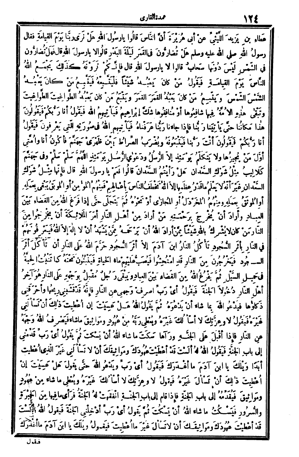 عَطاءِ بنِ يَزيدَ اللَّيْثِيِّ، عنْ أبي هُرَيْرَةَ أنَّ النَّاسَ قالُوا: يَا رسُولَ الله هَلْ نَرَى ربَّنا يَوْمَ القِيامَةِ؟ فَقَالَ رسولُ الله هَلْ تُضارُّونَ فِي القَمَرِ لَيْلَةَ البَدْرِ؟ قالُوا: لَا يَا رسولَ الله. قَالَ: فَهَلْ تُضارُّونَ فِي الشّمْسِ لَيْسَ دُونَها سَحابٌ؟ قَالُوا: لَا يَا رسولَ الله، قَالَ: فإنَّكَمْ تَرَوْنَهُ كَذَلِكَ يَجْمَعُ الله النَّاسَ يَوْمَ القِيامَةِ فَيَقُولُ: مَنْ كانَ يَعْبُدُ شَيْئاً فلْيَتَّبِعْهُ، فَيَتَّبِعُ مَنْ كانَ يَعْبُدُ الشَّمْسَ الشّمْسَ، ويَتّبِعُ مَنْ كانَ يَعْبُدُ القَمَرَ القَمَرَ، ويَتْبَعُ مَنْ كانَ يَعْبُدُ الطَّواغِيتَ، الطَّواغِيتَ وتَبْقاى هاذِهِ الأُمَّةُ فِيها شافِعُوها أَو مُنافِقُوها شَكَّ إبْرَاهِيمُ فَيَأْتِيهِمُ الله فَيَقُولُ: أَنا رَبُّكُمْ فَيَقُولُونَ هاذَا مَكانُنا حتَّى يَأْتِينَا رَبُّنا، فَإِذا جاءَنا عَرَفْنَاهُ، فَيَأْتِيهِمِ الله فِي صُورَتِهِ الَّتِي يَعْرِفُوَن، فَيَقُولُ: أَنا رَبُّكُمْ فَيَقُولُونَ: أنْتَ رَبُّنَا فَيَتْبَعُونَهُ، ويُضْرَبُ الصِّراطُ بَيْنَ ظَهْرَيْ جَهَنَّمَ، فأكُونُ أَنا وأُمتَّي أوَّلَ مَنْ يُجِيزُها، وَلَا يَتَكَلَّمُ يَوْمَئِذٍ إلاّ الرُّسُلُ، ودَعواى الرُّسُلَ يَوْمَئِذٍ: اللَّهُمَّ سَلِّمْ سَلِّمْ، وَفِي جَهَنَّمَ كَلالِيبُ مِثْلُ شَوْكِ السَّعْدان، هَلْ رَأيْتُمُ السَّعْدانَ؟ قالُوا: نَعَمْ يَا رسولَ الله قَالَ: فإنّها مِثْلُ شَوْكِ السَّعْدانِ غَيْرَ أنَّهُ لَا يَعْلَمُ مَا قَدْرُ عِظَمِها إِلَّا الله، تَخْطَفُ النّاسَ بِأعْمالِهِمْ، فَمِنْهُمُ المُؤْمِنُ أوِ المُوبَقُ يَبْقى بِعَمَلِهِ أوِ المُوثَقُ بِعَمَلِهِ، ومِنْهُمُ المُخَرْدَلُ أوِ المُجازاى أوْ نَحْوُهُ، ثُمَّ يَتَجَلّى حتَّى إِذا فَرَغَ الله مِنَ القَضاءِ بَيْنَ العِبَادِ وأرادَ أنْ يُخْرِجَ بِرَحْمَتِهِ مَنْ أرادَ مِنْ أهْلِ النّارِ أمَرَ المَلائِكَةَ أنْ يُخْرِجُوا مِنَ النّارَ، مَنْ كَانَ لَا يُشْرِكُ بِاللَّه شَيْئاً مِمَّنْ أرادَ الله أنْ يَرْحَمَهُ مِمَّنْ يَشْهَدُ أنْ لَا إلاهَ إِلَّا الله، فَيَعْرِفُونَهُمْ فِي النَّارِ بِأثَرِ السُّجُودِ تَأْكُلُ النّارُ ابنَ آدَمَ إلاّ أثَرَ السُّجُودِ، حَرَّمَ الله على النّار أَن تَأْكُلَ أثَرَ السجُود، فَيَخْرُجُونَ مِنَ النّارِ قَدِ امْتُحِشُوا، فَيُصَبُّ عَلَيْهِمْ ماءُ الحَياةِ، فَيَنْبُتُون تَحْتَهُ كَمَا تَنْبُتُ الحِبَّةُ فِي حَمِيلِ السَّيْلِ، ثُمَّ يَفْرُغُ الله مِنَ القَضاءِ بَيْنَ العِبادِ ويَبْقَى رَجُلٌ مُقْبِلٌ بِوَجْهِهِ عَلى النّارِ هُوَ آخِرُ أهْلِ النّارِ دُخولاً الجَنَّةَ، فَيَقُولُ: أيْ رَبِّ اصرِفْ وَجْهِي عَن النّارِ، فإنَّهُ قَدْ قَشَبنِي رِيحُها وأحْرَقَنِي ذَكاؤُها، فَيَدْعُو الله بِما شاءَ أنْ يَدْعُوَهُ ثُمَّ يَقُولُ الله: هَلْ عَسِيْتَ إِن أُعْطِيتَ ذالِكَ أَن تَسْألَنِي غَيْرَهُ؟ فَيَقُولُ: لَا وعِزَّتِكَ. لَا أسْألُكَ غَيْرَهُ، ويُعْطِي رَبَّهُ مِنْ عُهُودٍ ومَواثِيقَ مَا شاءَ، فَيَصْرِفُ الله وَجْهَهُ عنِ النّارِ، فَإِذا أقْبَلَ عَلى الجَنَّةِ ورَآها سَكَتَ مَا شاءَ الله أنْ يَسْكتَ، ثُمَّ يَقُولُ: أيْ رَبِّ قَدِّمْنِي إِلَى بابِ الجَنَّةِ، فَيَقُولُ الله لهُ: ألَسْتَ قَدْ أعْطَيْتَ عُهُودَكَ ومَواثِيقَكَ أنْ لَا تَسْألَنِي غَيْرَ الّذِي أُعْطيتَ أبَداً؟ وَيْلَكَ يَا ابْنَ آدَمَ مَا أغْدَرَكَ،