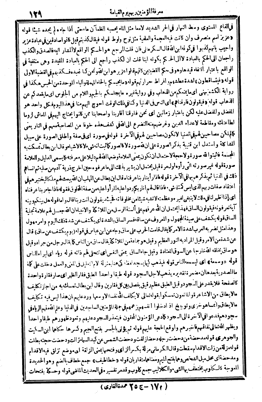 فِي القاع المستوي وسط النَّهَار فِي الْحر الشَّديد لامعاً مثل المَاء {وَالَّذِينَ كَفَرُو اْ أَعْمَالُهُمْ كَسَرَابٍ بِقِيعَةٍ يَحْسَبُهُ الظَّمْآنُ مَآءً حَتَّى إِذَا جَآءَهُ لَمْ يَجِدْهُ شَيْئاً وَوَجَدَ اللَّهَ عِندَهُ فَوَفَّاهُ حِسَابَهُ وَاللَّهُ سَرِيعُ الْحِسَابِ} قَوْله: عُزَيْر اسْم منصرف وَإِن كَانَت فِيهِ العجمة والعلمية، مثل نوح وَلُوط، قَوْله: فَيُقَال كَذبْتُمْ قيل: كَانُوا صَادِقين فِي عبَادَة عُزَيْر؟ وَأجِيب بِأَنَّهُم كذبُوا فِي كَونه ابْن الله. قَالَ الْكرْمَانِي؛ فَإِن قلت: الْمرجع هُوَ الحكم الْوَاقِع لَا الْمشَار إِلَيْهِ، فالصدق وَالْكذب راجعان إِلَى الحكم بِالْعبَادَة لَا إِلَى الحكم بِكَوْنِهِ ابْنا. قلت: إِن الْكَذِب رَاجع إِلَى الحكم بِالْعبَادَة الْمقيدَة وَهِي منتفية فِي الْوَاقِع بِاعْتِبَار انْتِفَاء قيدها، وَهُوَ فِي حكم القضيتين كَأَنَّهُمْ قَالُوا: عُزَيْر هُوَ ابْن الله وَنحن كُنَّا نعبده، فكذبهم فِي الْقَضِيَّة الأولى. قَوْله: فيتساقطون لشدَّة عطشهم وإفراط حرارتهم. قَوْله: مَا يحبسكم؟ بِالْحَاء الْمُهْملَة وَالْبَاء الْمُوَحدَة من الْحَبْس، هَكَذَا فِي رِوَايَة الْكشميهني أَي: مَا يمنعكم من الذّهاب؟ وَفِي رِوَايَة غَيره: مَا يجلسكم؟ بِالْجِيم وَاللَّام من الْجُلُوس أَي: مَا يقعدكم عَن الذّهاب؟ قَوْله: فَيَقُولُونَ: فارقناهم أَي: النَّاس فِي الدُّنْيَا وَكُنَّا فِي ذَلِك الْوَقْت أحْوج إِلَيْهِم منا فِي هَذَا الْيَوْم فَكل وَاحِد هُوَ الْمفضل والمفضل عَلَيْهِ لَكِن بِاعْتِبَار زمانين أَي: نَحن فارقنا أقاربنا وأصحابنا مِمَّن كَانُوا يحْتَاج إِلَيْهِم فِي المعاش لُزُوما لطاعتك ومقاطعة لأعداء الدّين وغرضهم مِنْهُ التضرع إِلَى الله فِي كشف هَذِه خوفًا من المصاحبة مَعَهم فِي النَّار، يَعْنِي: كَمَا لم نَكُنْ مصاحبين لَهُم فِي الدُّنْيَا لَا نَكُون مصاحبين لَهُم فِي الْآخِرَة. قَوْله: فِي صُورَة أَي: فِي صفة. وَأطلق الصُّورَة على سَبِيل المشاكلة، وَاسْتدلَّ ابْن قُتَيْبَة بِذكر الصُّورَة على أَن لله صُورَة لَا كالصور، كَمَا ثَبت أَنه شَيْء لَا كالأشياء. وَقَالَ ابْن بطال: تمسكت بِهِ المجسمة فأثبتوا لله صُورَة، وَلَا حجَّة لاحْتِمَال أَن تكون بِمَعْنى الْعَلامَة وَضعهَا الله لَهُم دَلِيلا على مَعْرفَته، كَمَا يُسمى الدَّلِيل والعلامة صُورَة. قَوْله: غير صورته الَّتِي رَأَوْهُ أول مرّة قيل: يحْتَمل أَن يُشِير بذلك إِلَى مَا عرفوه حِين أخرج ذُرِّيَّة آدم من صلبه. ثمَّ أنساهم ذَلِك فِي الدُّنْيَا، ثمَّ يذكرهم بهَا فِي الْآخِرَة. قَوْله: فَإِذا رَأينَا رَبنَا عَرفْنَاهُ قَالَ ابْن بطال: عَن الْمُهلب أَن الله يبْعَث لَهُم ملكا ليختبرهم فِي اعْتِقَاد صِفَات رَبهم الَّذِي لَيْسَ كمثله شَيْء، فَإِذا قَالَ لَهُم: أَنا ربكُم، ردوا عَلَيْهِ لما رَأَوْا عَلَيْهِ من صفة الْمَخْلُوق، فَقَوله: فَإِذا جَاءَ رَبنَا عَرفْنَاهُ أَي: إِذا أظهر لنا فِي ملك لَا يَنْبَغِي لغيره وعظمته لَا تشبه شَيْئا من مخلوقاته فحينئذٍ يَقُولُونَ: أَنْت رَبنَا. قَالَ: وَأما قَوْله: هَل بَيْنكُم وَبَينه آيَة تعرفونه؟ فَيَقُولُونَ: السَّاق فَهَذَا يحْتَمل أَن الله عرفهم على أَلْسِنَة الرُّسُل من الْمَلَائِكَة والأنبياء أَن الله جعل لَهُم عَلامَة تجلية السَّاق. قَوْله: يكْشف على صِيغَة الْمَجْهُول وَالْمَعْرُوف عَن سَاقه فسر السَّاق بالشدة أَي: يكْشف عَن شدَّة ذَلِك الْيَوْم وَأمر مهول وَهَذَا مثل تضربه الْعَرَب لشدَّة الْأَمر كَمَا يُقَال: قَامَت الْحَرْب على سَاق، وَجَاء عَن ابْن عَبَّاس فِي قَوْله: {يَوْمَ يُكْشَفُ عَن سَاقٍ وَيُدْعَوْنَ إِلَى السُّجُودِ فَلاَ يَسْتَطِيعُونَ} قَالَ: عَن شدَّة من الْأَمر. وَقيل: المُرَاد بِهِ النُّور الْعَظِيم، وَقيل: هُوَ جمَاعَة من الْمَلَائِكَة يُقَال: سَاق من النَّاس، كَمَ