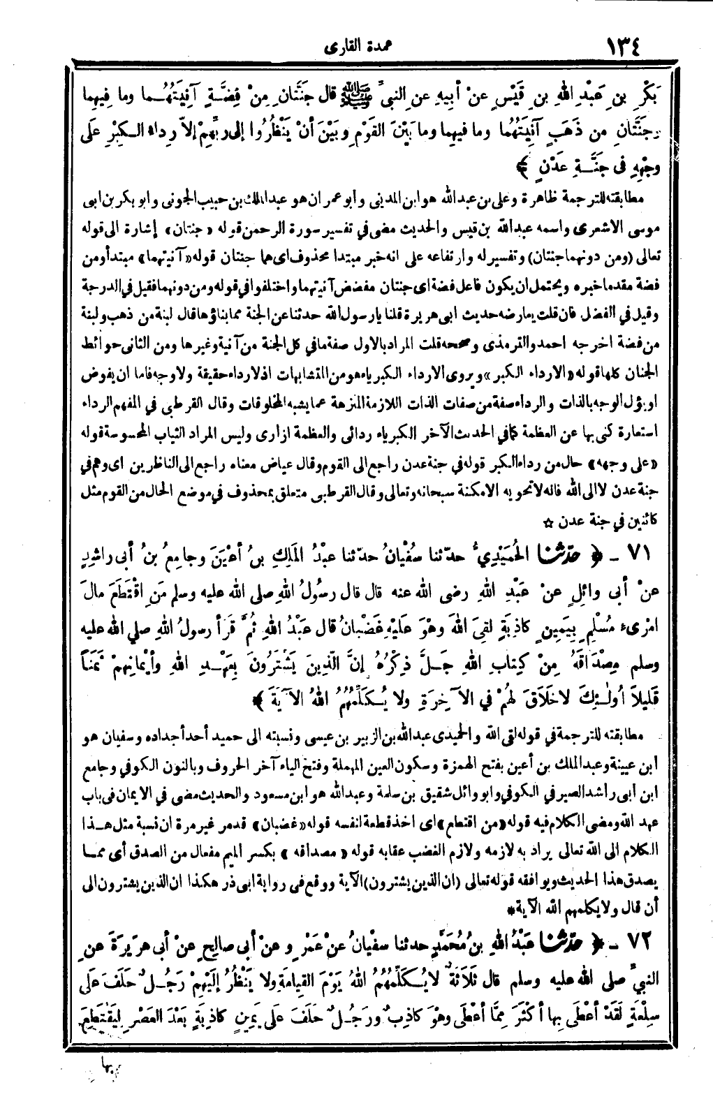 بَكْرِ بنِ عَبْدِ الله بنِ قَيْسٍ عنْ أبِيهِ عنِ النبيِّ صلى الله عَلَيْهِ وَسلم قَالَ: جَنَّتانِ مِنْ فِضَّةٍ آنِيَتُهُما وَمَا فِيهِما، وجَنَّتانِ من ذَهَبٍ، آنِيَتُهُما وَمَا فِيهِما، وَمَا بَيْنَ القَوْمِ وبَيْنَ أنْ يَنْظُرُوا إِلَى ربِّهِمْ إلاّ رِداءُ الكِبْرِ عَلى وجْههِ فِي جَنَّةِ عَدْنٍ