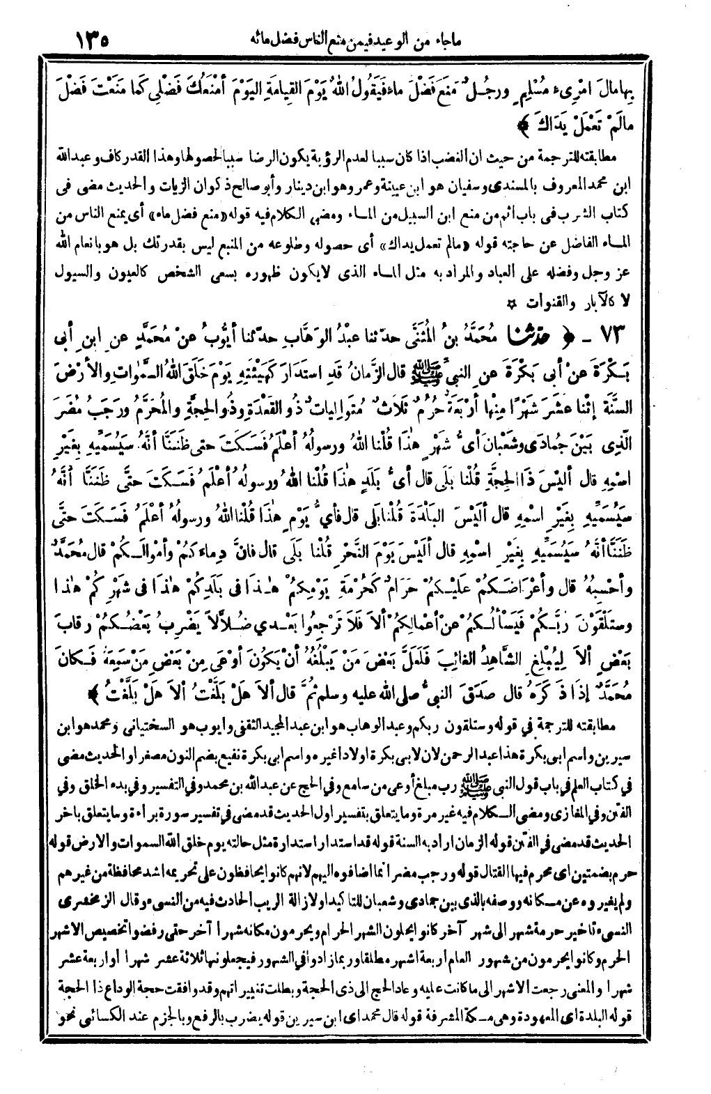 7447 - حدّثنا مُحَمَّدُ بنُ المُثَنَّى، حدّثنا عَبْدُ الوَهَّابِ، حدّثنا أيُّوبُ، عنْ مُحَمَّدٍ، عنِ ابنِ أبي بَكْرَةَ، عنْ أبي بَكْرَةَ، عنِ النبيِّ صلى الله عَلَيْهِ وَسلم قَالَ: الزَّمانُ قَدِ اسْتَدَارَ كَهَيْئَتِهِ يَوْمَ خَلْقَ الله السَّماوَاتِ والأرْضَ، السَّنَة اثْنا عَشَرَ شَهْراً، مِنْهَا أرْبَعَةٌ حُرُمٌ: ثَلاَثٌ مُتَوَالِياتٌ: ذُو القَعْدَةِ، وذُو الحِجَّةِ، والمُحَرَّمُ، ورَجَبُ مُضَرَ الّذِي بَيْنَ جُمادَى وشَعْبانَ، أيُّ شَهْرٍ هاذَا؟ قُلْنا: الله ورسولُهُ أعْلَمُ، فَسَكَتَ حَتَّى ظَنَنَّا أنَّهُ سَيُسَمِّيهِ بِغَيْرِ اسْمِهِ، قَالَ: ألَيْسَ ذَا الحِجَّةِ؟ قُلْنا: بَلَى. قَالَ: أيُّ بَلَدٍ هاذَا؟ قُلْنا: الله ورسولُهُ أعْلَمُ، فَسَكَتَ حتَّى ظَنَنَّا أنَّهُ سَيُسَمِّيهِ بِغَيْرِ اسْمِهِ. قَالَ: ألَيْسَ البَلدَةَ قُلْنا: بَلَى. قَالَ: فأيُّ يَوْمٍ هاذَا؟ قُلْنا: الله ورسولُهُ أعْلَمُ، فَسَكَتَ حتَّى ظَنَنَّا أنَّهُ سَيُسَمِّيهِ بِغَيْرِ اسْمِهِ، قَالَ: أَلَيْسَ يَوْمَ النَّحْرِ قُلْنا: بَلَى. قَالَ: فَإنَّ دِماءَكُمْ وأمْوالَكُمْ قَالَ مُحَمَّدٌ وأحْسِبُهُ قَالَ: وأعْرَاضَكُمْ عَلَيْكُمْ حَرَامٌ كَحُرْمَةِ يَوْمِكُمْ هاذَا، فِي بَلَدِكُمْ هاذَا فِي شَهْرِكُمْ هاذَا، وستَلْقَوْنَ ربَّكُمْ فَيَسْألُكُمْ عنْ أعْمالِكُمْ، ألاَ فَلاَ تَرْجِعُوا بَعْدي ضُلاَّلاً يَضْرِبُ بَعْضُكْمْ رقابَ بَعْضٍ، ألاَ لِيُبْلِغِ الشَّاهِدُ الغائِبَ، فَلَعَلَّ بَعْضَ مَنْ يَبْلُغُهُ أنْ يَكُونَ أوْعَى مِنْ بَعْضِ مَنْ سَمِعَهُ فَكَانَ مُحَمَّدٌ إذَا ذَكَرَهُ قَالَ: صَدَقَ النبيُّ ثُمَّ قَالَ: ألاَ هَلْ بَلّغْتُ ألاَ هَلْ بَلَّغْتُ