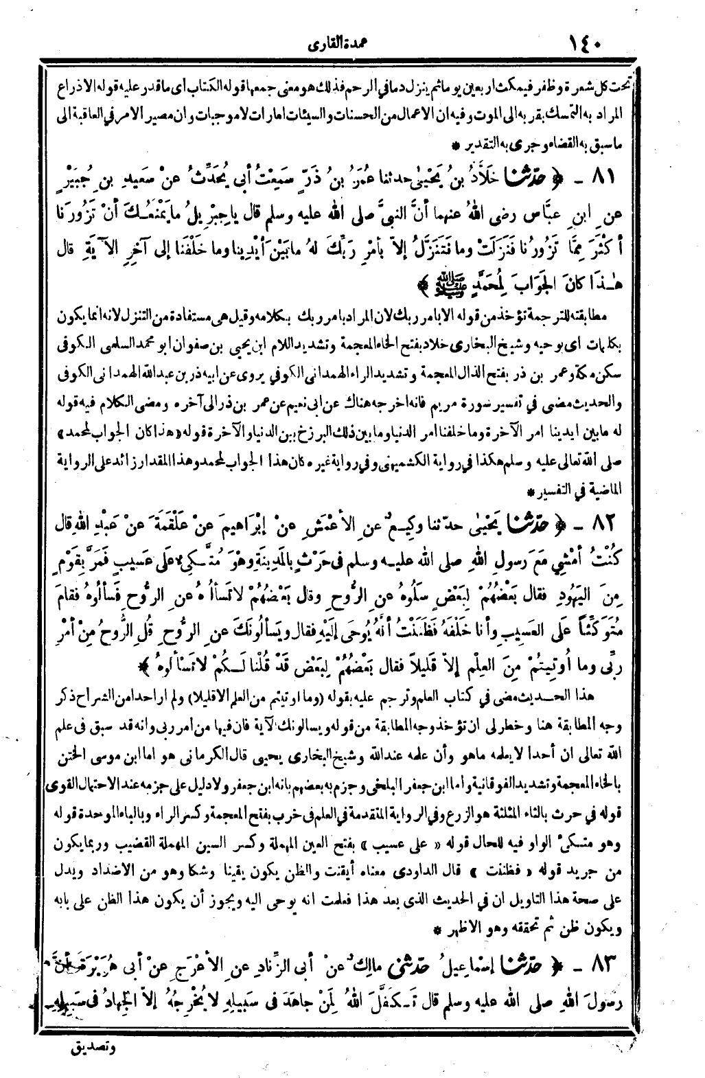 7455 - حدّثنا خَلاَّدُ بنُ يَحْياى، حَدثنَا عُمَرُ بنُ ذَرَ، سَمِعْتُ أبي يُحَدِّثُ عنْ سَعِيدِ بنِ جُبَيْرٍ، عنِ ابنِ عبَّاسٍ رَضِي الله عَنْهُمَا، أنَّ النبيَّ صلى الله عَلَيْهِ وَسلم قَالَ: يَا جِبْرِيلُ مَا يَمْنَعُكَ أنْ تَزُورَنا أكْثَرَ مِمَّا تَزُورُنا؟ فَنَزَلَتْ {وَمَا تنزل إِلَّا بِأَمْر رَبك لَهُ مَا بَين أَيْدِينَا وَمَا خلفنا} إِلَى آخِرِ الآيَةِ.