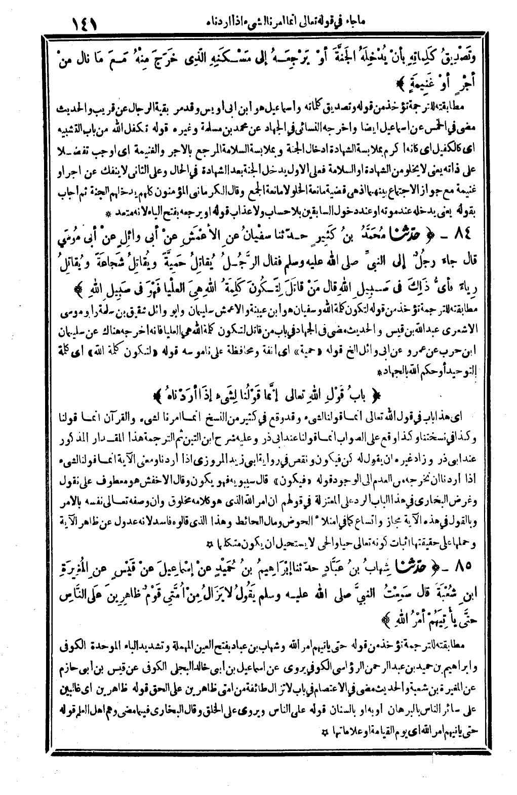 7458 - حدّثنا مُحَمَّدُ بنُ كَثِيرٍ، حدّثنا سُفيانُ، عنِ الأعْمَشِ، عنْ أبي وائِلٍ، عنْ أبي مُوسَى قَالَ: جاءَ رجُلٌ إِلَى النبيِّ فَقَالَ: الرَّجُلُ يُقاتِلُ حَمِيَّةً، ويُقاتِلُ شَجاعَةً، ويُقاتِلُ رِياءً، فأيُّ ذَلِكَ فِي سَبِيلِ الله؟ قَالَ: مَنْ قاتَلَ لِتَكُونَ كَلِمَةُ الله هِيَ العلْيا فَهْوَ فِي سَبيلِ الله