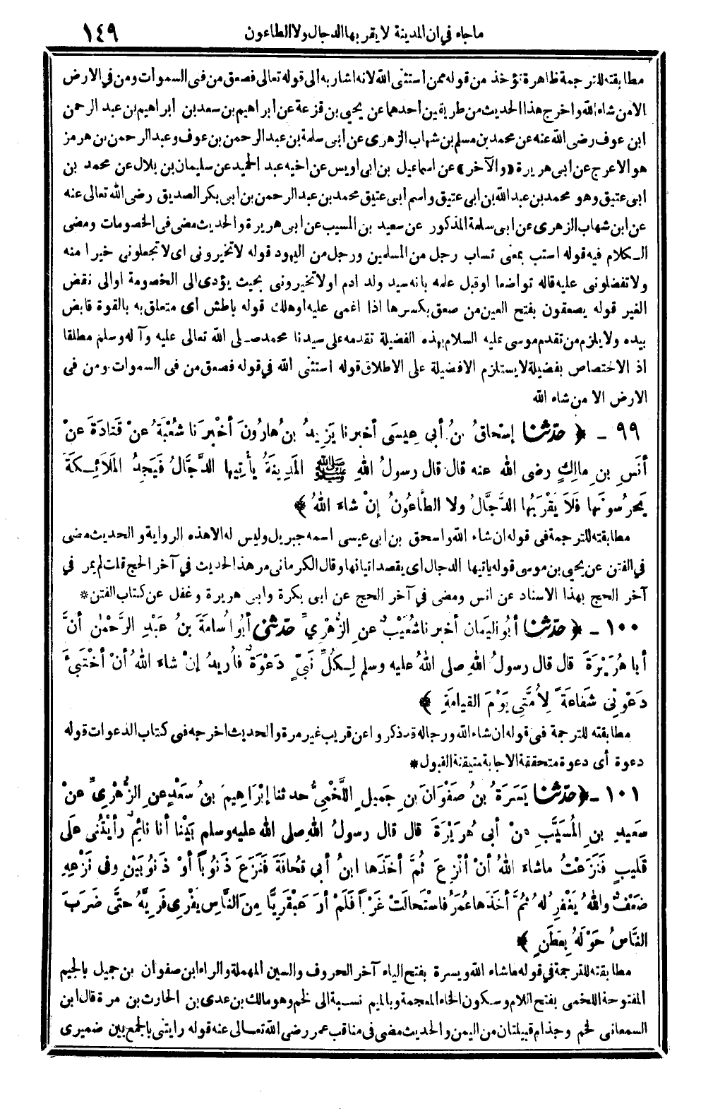 7473 - حدّثنا إسْحاقُ بنُ أبي عِيسَى، أخبرنَا يَزِيدُ بنُ هارُونَ، أخْبَرَنا شُعْبَةُ، عنْ قَتادَةَ عنْ أنَسِ بنِ مالِكٍ، رَضِي الله عَنهُ، قَالَ: قَالَ رسولُ الله صلى الله عَلَيْهِ وَسلم المَدِينَةُ يأْتيها الدَّجَّالُ فَيَجِدُ المَلاَئِكَةَ يَحْرُسونَها، فَلاَ يَقْرَبُها الدَّجَّالُ وَلَا الطَّاعُونُ، إنْ شاءَ الله