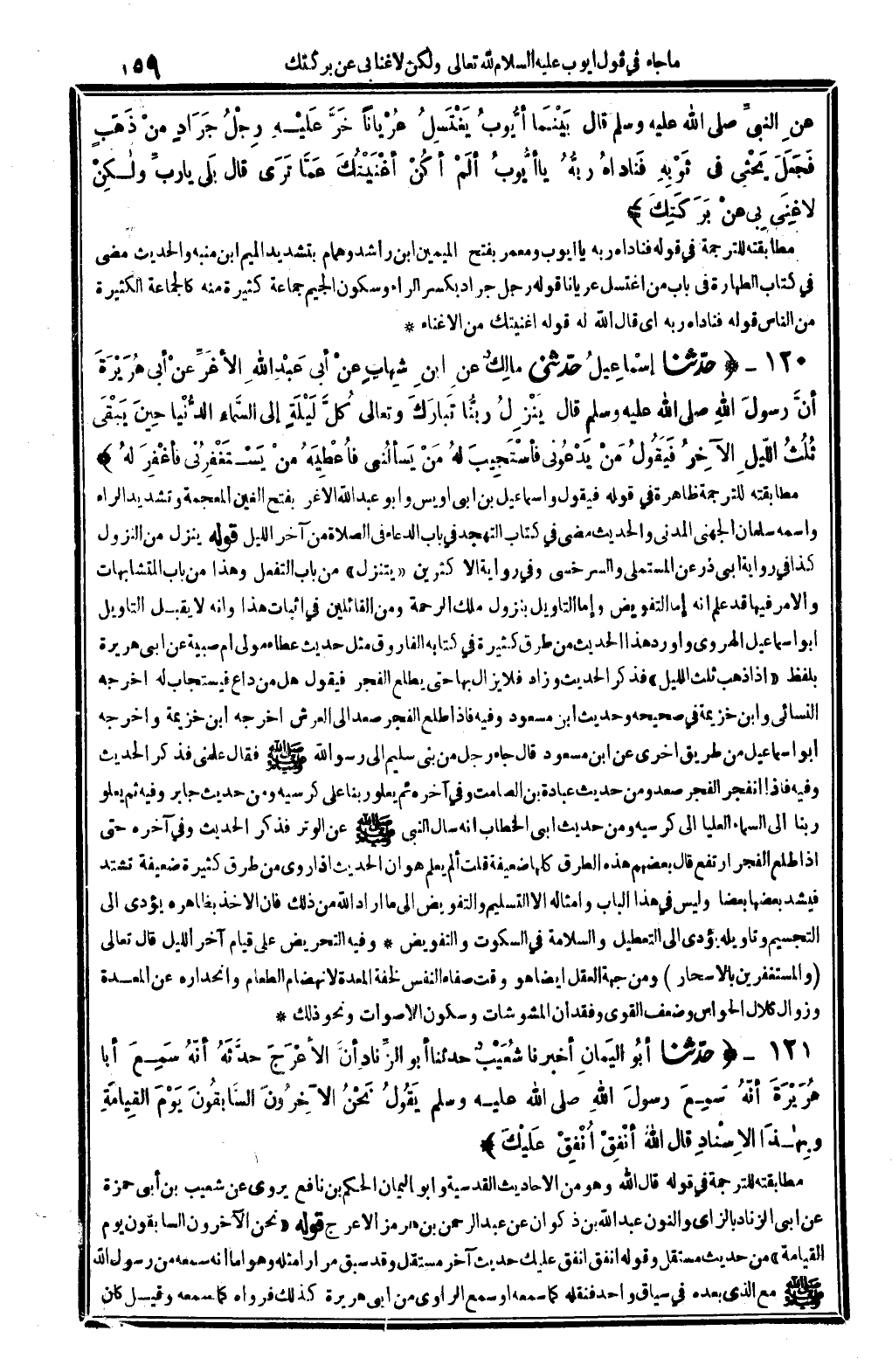 عنِ النبيِّ صلى الله عَلَيْهِ وَسلم قَالَ: بَيْنَما أيُّوبُ يَغْتَسِلُ عُرْياناً خَرَّ عَلَيْهِ رِجْلُ جَرَادٍ مِنْ ذَهَبٍ، فَجَعَلَ يَحْثِي فِي ثَوْبِهِ فَناداهُ ربُّهُ: يَا أيُّوبُ ألَمْ أكُنْ أغْنَيْتُكَ عَمَّا تَرَى؟ قَالَ: بَلَى يَا ربِّ، ولاكِنْ لَا غِنَى بِي عنْ بَرَكَتِكَ