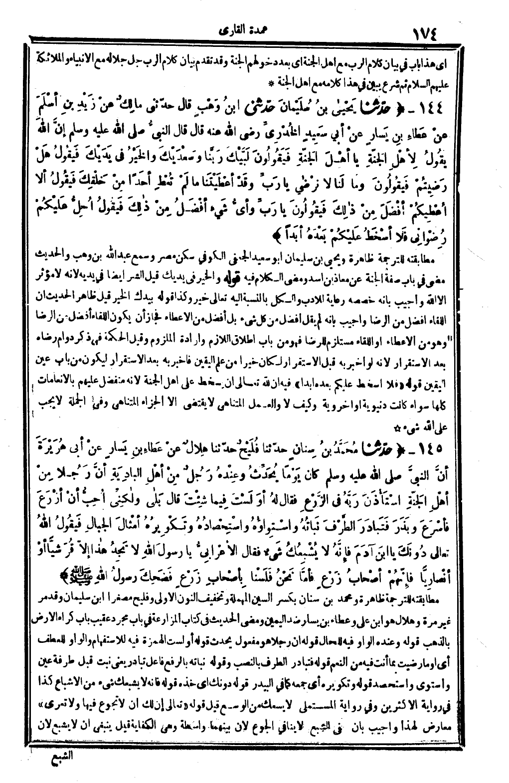 7519 - حدّثنا مُحَمَّدُ بنُ سِنان، حدّثنا فُلَيْحٌ، حدّثنا هِلالٌ، عنْ عَطاءِ بنِ يَسارٍ عنْ أبي هُرَيْرَةَ أنَّ النبيَّ صلى الله عَلَيْهِ وَسلم كَانَ يَوْماً يُحَدِّثُ، وعِنْدَهُ رَجُلٌ مِنْ أهْلِ البادِيةِ: أنَّ رَجُلاً مِنْ أهْلِ الجَنّةِ اسْتَأْذَنَ رَبَّهُ فِي الزَّرْعِ، فَقَالَ لهُ: أوَ لَسْتَ فِيما شِئْتَ؟ قَالَ: بَلاى ولاكِنِّي أُحِبُّ أنْ أزْرَعَ، فأسْرَعَ وبَذَرَ، فَتَبادَرَ الطَّرْفَ نَباتُهُ واسْتِواؤُهُ واسْتِحْصادُهُ وتَكْوِيرُهُ أمْثالَ الجِبالِ، فَيقُولُ الله تَعَالَى: دُونَكَ يَا ابنَ آدَمَ فإنَّهُ لَا يُشْبِعُكَ شَيْءٌ