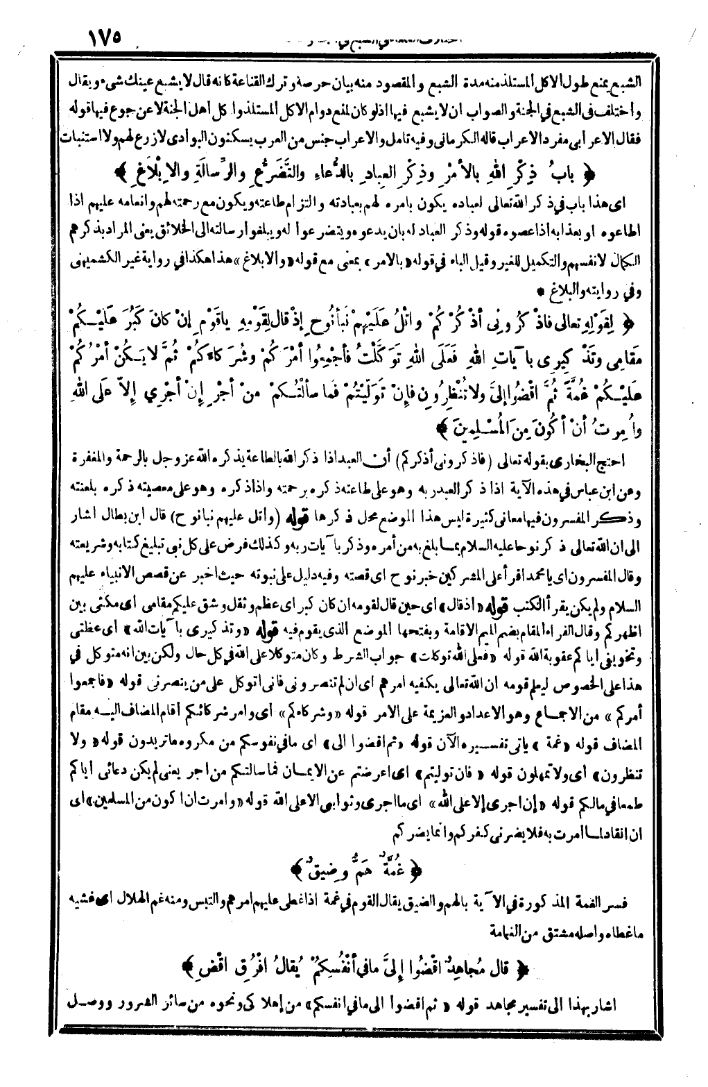 قَوْله {واتل عَلَيْهِم نبأ نوح} قَالَ ابْن بطال: أَشَارَ إِلَى أَن الله تَعَالَى ذكر نوحًا، عَلَيْهِ السَّلَام، بِمَا بلغ بِهِ من أمره وَذكر بآيَات ربه، وَكَذَلِكَ فرض على كل نَبِي تَبْلِيغ كِتَابه وشريعته. وَقَالَ الْمُفَسِّرُونَ: أَي يَا مُحَمَّد اقْرَأ على الْمُشْركين خبر نوح أَي: قصَّته، وَفِيه دَلِيل على نبوته حَيْثُ أخبر عَن قصَص الْأَنْبِيَاء، عَلَيْهِم السَّلَام، وَلم يكن يقْرَأ الْكتب. قَوْله: {إِذا قَالَ} أَي: حِين قَالَ لِقَوْمِهِ: {إِن كانبحير} أَي عظم وَثقل وشق {عَلَيْكُم مقَامي} أَي مكثي بَين أظْهركُم. وَقَالَ الْفراء: الْمقَام بِضَم الْمِيم الْإِقَامَة وَبِفَتْحِهَا الْموضع الَّذِي يقوم فِيهِ. قَوْله: {وتذكيري بآيَات الله} أَي: عظتي وتخويفي إيَّاكُمْ عُقُوبَة الله. قَوْله: {فعلى الله توكلت} جَوَاب الشَّرْط، وَكَانَ متوكلاً على الله فِي كل حَال، وَلَكِن بَين أَنه متوكل فِي هَذَا على الْخُصُوص ليعلم قومه أَن الله تَعَالَى يَكْفِيهِ أَمرهم أَي: إِن لم تنصروني فَإِنِّي أتوكل على من ينصرني. قَوْله: {فاجمعوا أَمركُم} من الْإِجْمَاع وَهُوَ الإعداد والعزيمة على الْأَمر. قَوْله: {وشركاءكم} أَي: وَأمر شركائكم، أَقَامَ الْمُضَاف إِلَيْهِ مقَام الْمُضَاف. قَوْله: غمَّة يَأْتِي تَفْسِيره الْآن. قَوْله: {ثمَّ اقضوا عَليّ} أَي: مَا فِي نفوسكم من مَكْرُوه مَا تُرِيدُونَ. قَوْله: أَي: وَلَا تمهلون. قَوْله: {وَلَا تنْظرُون} أَي: أعرضتم عَن الْإِيمَان {فَمَا سألتكم من أجر} يَعْنِي: لم يكن دعائي إيَّاكُمْ طَمَعا فِي مالكم. قَوْله: {إِن أجري إِلَّا على الله} أَي: مَا أجري وثوابي إلاَّ على الله. قَوْله: {أمرت أَن أكون من الْمُسلمين} أَي: أَن أنقاد لما أمرت بِهِ فَلَا يضرني كفركم وَإِنَّمَا يضركم.