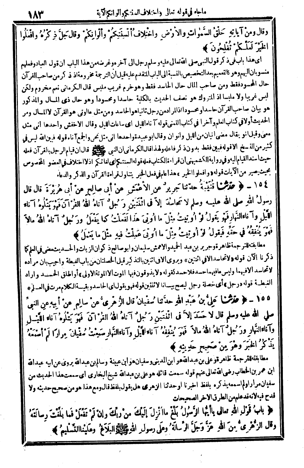 7529 - حدّثنا عَلِيُّ بنُ عَبْدِ الله، حدَّثنا سُفْيانُ، قَالَ الزُّهْرِيُّ: عنْ سالِمٍ عنْ أبِيهِ عنِ النبيِّ صلى الله عَلَيْهِ وَسلم قَالَ: لاَ حَسَدَ فِي اثْنَتَيْنِ: رَجُلٌ آتاهُ الله القُرْآنَ فَهْوَ يَتْلُوهُ آناءَ اللَّيْلِ وآناءَ النَّهارِ، ورَجُلٌ آتاهُ الله مَالا فَهو يُنْفِقُهُ آناءَ اللَّيْلِ وآناءَ النَّهارِ.
