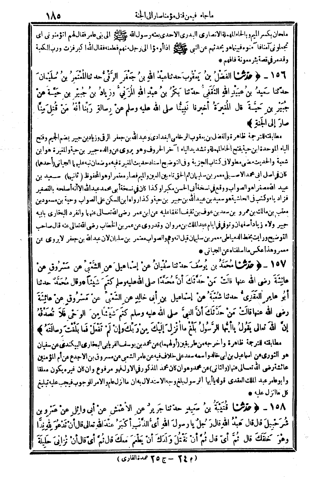 والْحَدِيث مضى مطولا فِي كتاب الْجِزْيَة. وَفِي التَّوْضِيح إِسْنَاد حَدِيث الْمُغيرَة فِيهِ موضعان نبه عَلَيْهِمَا الجياني. أَحدهمَا: كَانَ فِي أصل أبي مُحَمَّد الْأصيلِيّ معمر بن سُلَيْمَان، ثمَّ ألحق تَاء بَين الْعين وَالْمِيم فَصَارَ: مُعْتَمِرًا، وَهُوَ الْمَحْفُوظ ثَانِيهمَا: سعيد بن عبيد الله مُصَغرًا هُوَ الصَّوَاب، وَوَقع فِي نُسْخَة أبي الْحسن مكبراً، وَكَذَا كَانَ فِي نُسْخَة أبي مُحَمَّد عبد الله إلاَّ أَنه أصلحه بِالتَّصْغِيرِ فَزَاد يَاء وَكتب فِي الْحَاشِيَة: هُوَ سعيد بن عبيد الله بن جُبَير بن حَيَّة، وَكَذَا رَوَاهُ ابْن السكن على الصَّوَاب، وحية بن مَسْعُود بن معتب بن مَالك بن عَمْرو بن سعد بن عَوْف بن ثَقِيف، اتفقَا عَلَيْهِ، عَن ابْن عمر، رَضِي الله تَعَالَى عَنْهُمَا، وَانْفَرَدَ البُخَارِيّ بِأَبِيهِ جُبَير، ولاه زِيَاد أصفهان. وَتُوفِّي فِي أَيَّام عبد الْملك بن مَرْوَان، وَقد روى عَن عمر بن الْخطاب، رَضِي الله تَعَالَى عَنهُ، قَالَ صَاحب التَّوْضِيح ورايت بِخَط الدمياطي: معمر بن سُلَيْمَان، قيل: إِنَّه وهم وَالصَّوَاب مُعْتَمر بن سُلَيْمَان، لِأَن عبد الله بن جَعْفَر لَا يروي عَن معمر، وَهَذَا عكس مَا أسلفناه عَن الجياني.