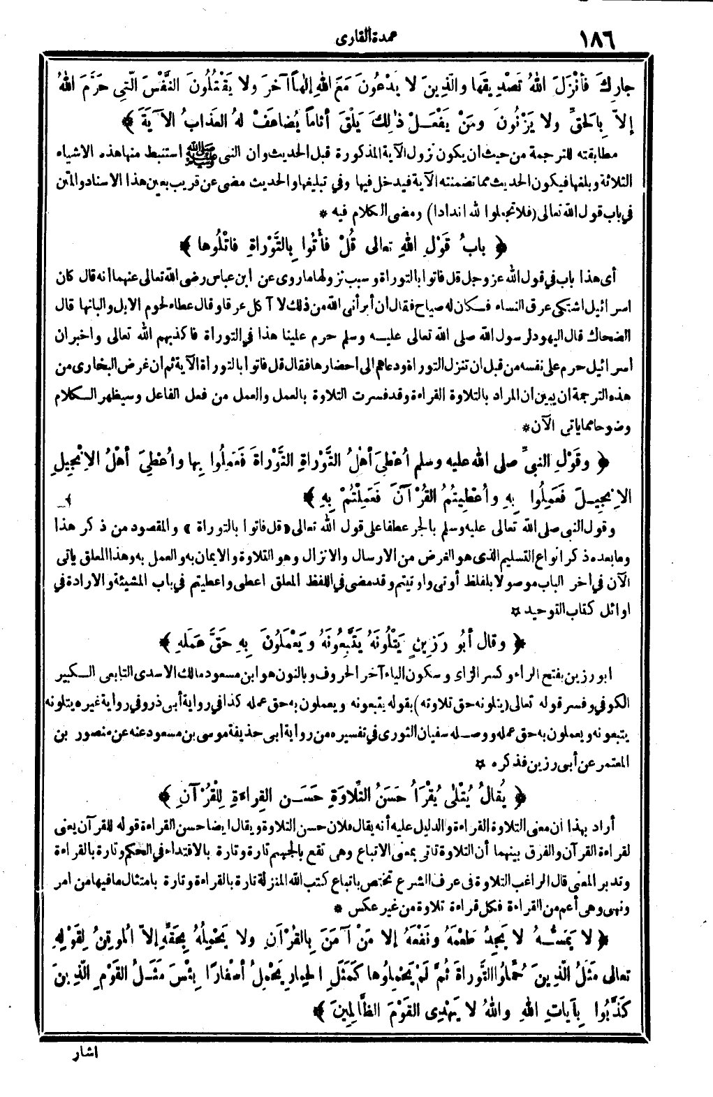 أَي: هَذَا بَاب فِي قَول الله عز وَجل: {قل فَأتوا بِالتَّوْرَاةِ} وَسبب نُزُولهَا مَا رُوِيَ عَن ابْن عَبَّاس، رَضِي الله تَعَالَى عَنْهُمَا، أَنه قَالَ: كَانَ إِسْرَائِيل اشْتَكَى عرق النِّسَاء فَكَانَ لَهُ صياح فَقَالَ: إِن أبرأني الله من ذَلِك لَا آكل عرقاً. وَقَالَ عَطاء: لُحُوم الْإِبِل وَأَلْبَانهَا. قَالَ الضَّحَّاك: قَالَ الْيَهُود لرَسُول الله، حرم علينا هَذَا فِي التَّوْرَاة، فأكذبهم الله تَعَالَى وَأخْبر أَن إِسْرَائِيل حرم على نَفسه من قبل أَن تنزل التَّوْرَاة ودعاهم إِلَى إحضارها، فَقَالَ: {قل فَأتوا بِالتَّوْرَاةِ} الْآيَة ثمَّ إِن غَرَض البُخَارِيّ من هَذِه التَّرْجَمَة أَن يبين أَن المُرَاد بالتلاوة الْقِرَاءَة، وَقد فسرت التِّلَاوَة بِالْعَمَلِ، وَالْعَمَل من فعل الْفَاعِل، وسيظهر الْكَلَام وضوحاً مِمَّا يَأْتِي الْآن.