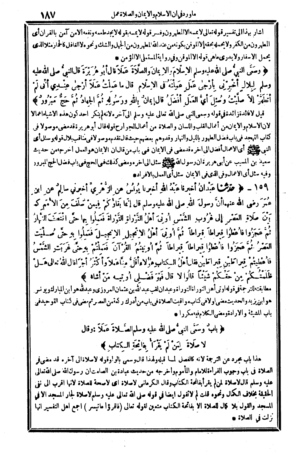 وسَمَّى النبيُّ الإسْلاَمَ والإيمَانَ والصَّلاَةَ عَمَلاً قَالَ أَبُو هُرَيْرَةَ: قَالَ النبيُّ لِبِلالٍ أخْبِرْنِي بِأرْجاى عَمَلٍ عَمِلْتَهُ فِي الإسْلاَمِ قَالَ: مَا عَمِلْتُ عَمَلاً أرْجاى عِنْدِي أنِّي لَمْ أتَطَهَّرْ إلاّ صَلَّيْتُ، وسُئِلَ: أيُّ العَمَلِ أفْضَلُ؟ قَالَ: إيمانٌ بِالله ورَسُولِهِ ثُمَّ الجِهادُ ثُمَّ حَجٌّ مَبْرُورٌ