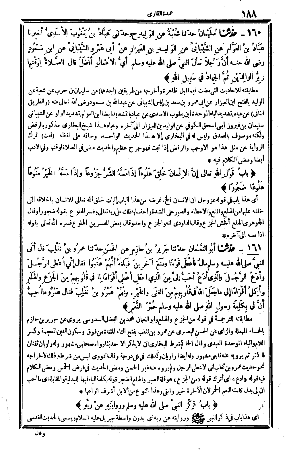 7534 - حدّثنا سُلَيْمانُ، حدّثنا شُعْبَةُ، عنِ الوَلِيدِ. وحدّثني عَبَّادُ بنُ يَعْقُوبَ الأسَدِيُّ، أخبرنَا عَبَّادُ بنُ العَوَّامِ، عنِ الشَّيْبانِيِّ، عنِ الوَلِيدِ بنِ العَيزارِ، عنْ أبي عَمْرْوٍ الشَّيْبانِيِّ، عنِ ابنِ مَسْعُودٍ، رَضِي الله عَنهُ، أنَّ رَجُلاً سَألَ النبيَّ أيُّ الأعْمالِ أفْضَلُ قَالَ: الصَّلاةُ لِوَقْتِها، وبِرُّ الوالِدَيْنِ ثُمَّ الجهادُ فِي سَبِيلِ الله