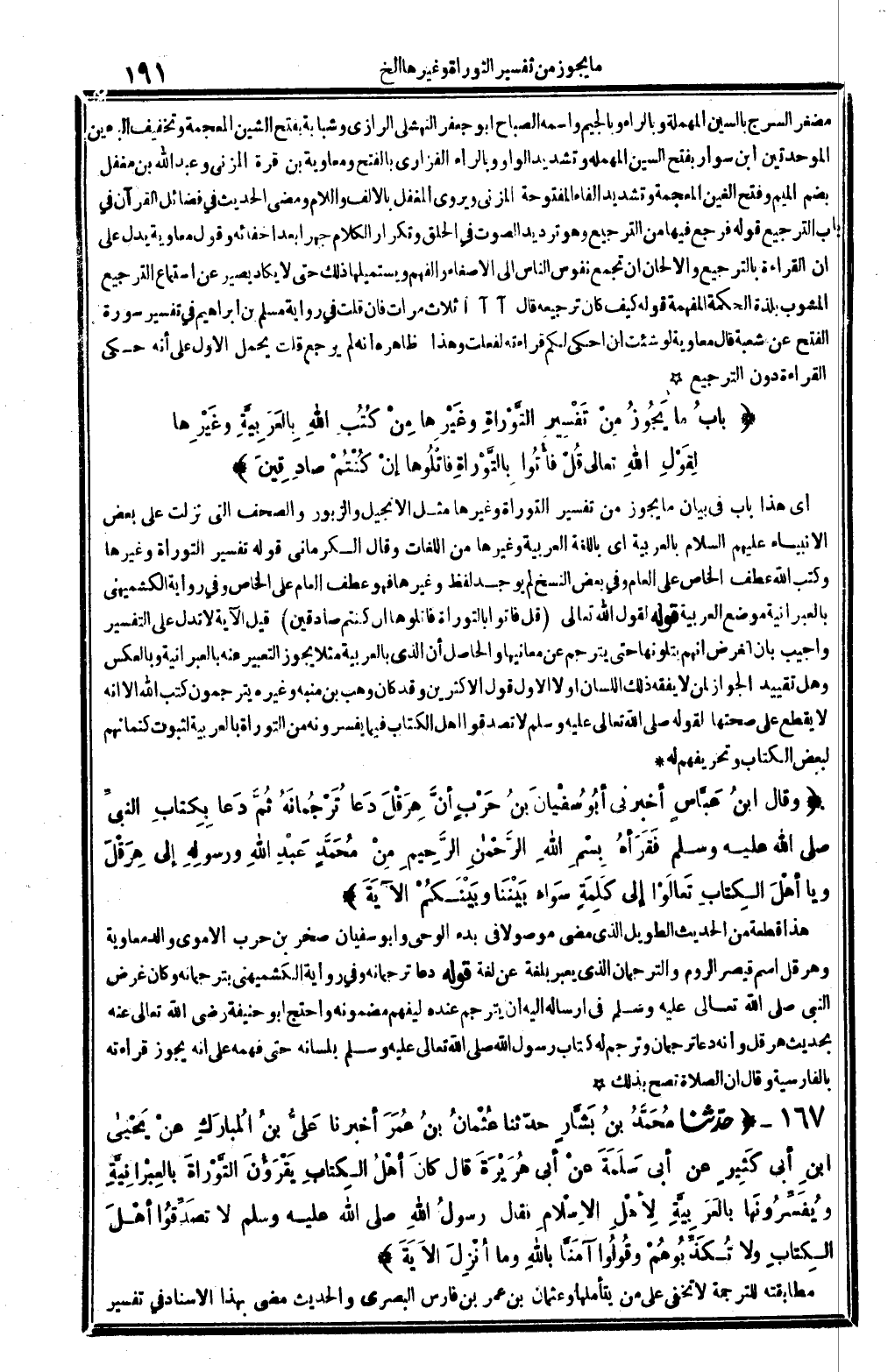 51 - (بابُ مَا يَجُوزُ مِنْ تَفْسِير التَّوْرَاةِ وغَيْرِها مِنْ كُتُبِ الله بِالعَرَبِيَّةِ وغيْرِهالِقَوْلِ الله تَعَالَى: {كُلُّ الطَّعَامِ كَانَ حِلاًّ لِّبَنِى إِسْرَاءِيلَ إِلاَّ مَا حَرَّمَ إِسْرَاءِيلُ عَلَى نَفْسِهِ مِن قَبْلِ أَن تُنَزَّلَ التَّوْرَاةُ قُلْ فَأْتُواْ بِالتَّوْرَاةِ فَاتْلُوهَا إِن كُنتُمْ صَادِقِينَ} )