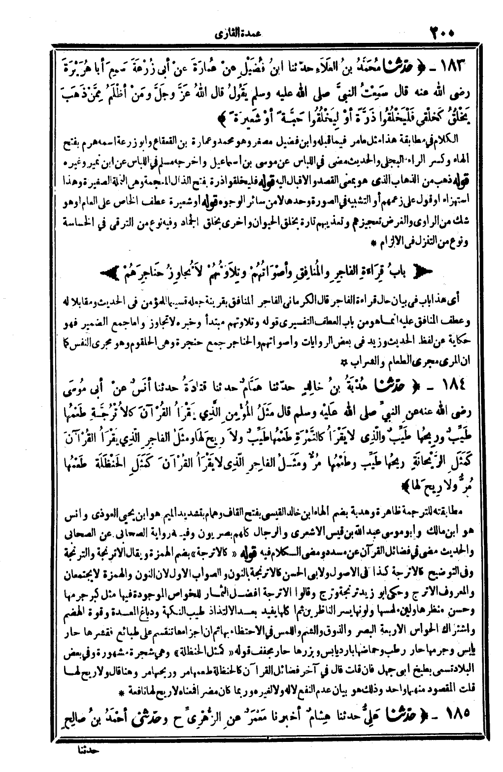7560 - حدّثنا هُدْبةُ بنُ خالِدٍ، حدّثنا هَمَّامٌ، حَدثنَا قتادَةُ، حَدثنَا أنسٌ عنْ أبي مُوسَى، رَضِي الله عَنهُ، عَن النبيِّ صلى الله عَلَيْهِ وَسلم قَالَ: مَثَلُ المُؤْمِنِ الَّذِي يَقْرَأُ القُرْآنَ كالأُتْرُجَّةِ، طَعْمُها طَيِّبٌ ورِيحُها طَيِّبٌ، والّذِي لَا يَقْرَأُ كالتَّمْرَةِ طَعْمُها طَيِّبٌ، ولاَ رِيحَ لَها، ومَثَلُ الفاجِرِ الّذِي يَقْرَأُ القُرْآنَ، كَمَثَلِ الرَّيْحانَةِ ريحُها طَيِّبٌ وطَعْمها مُرٌّ، ومَثَلُ الفاجِرِ الّذِي لَا يَقْرَأُ القُرْآنَ كَمَثَلِ الحَنْظَلَةِ طَعْمُها مُرٌّ وَلَا رِيحَ لَهَا