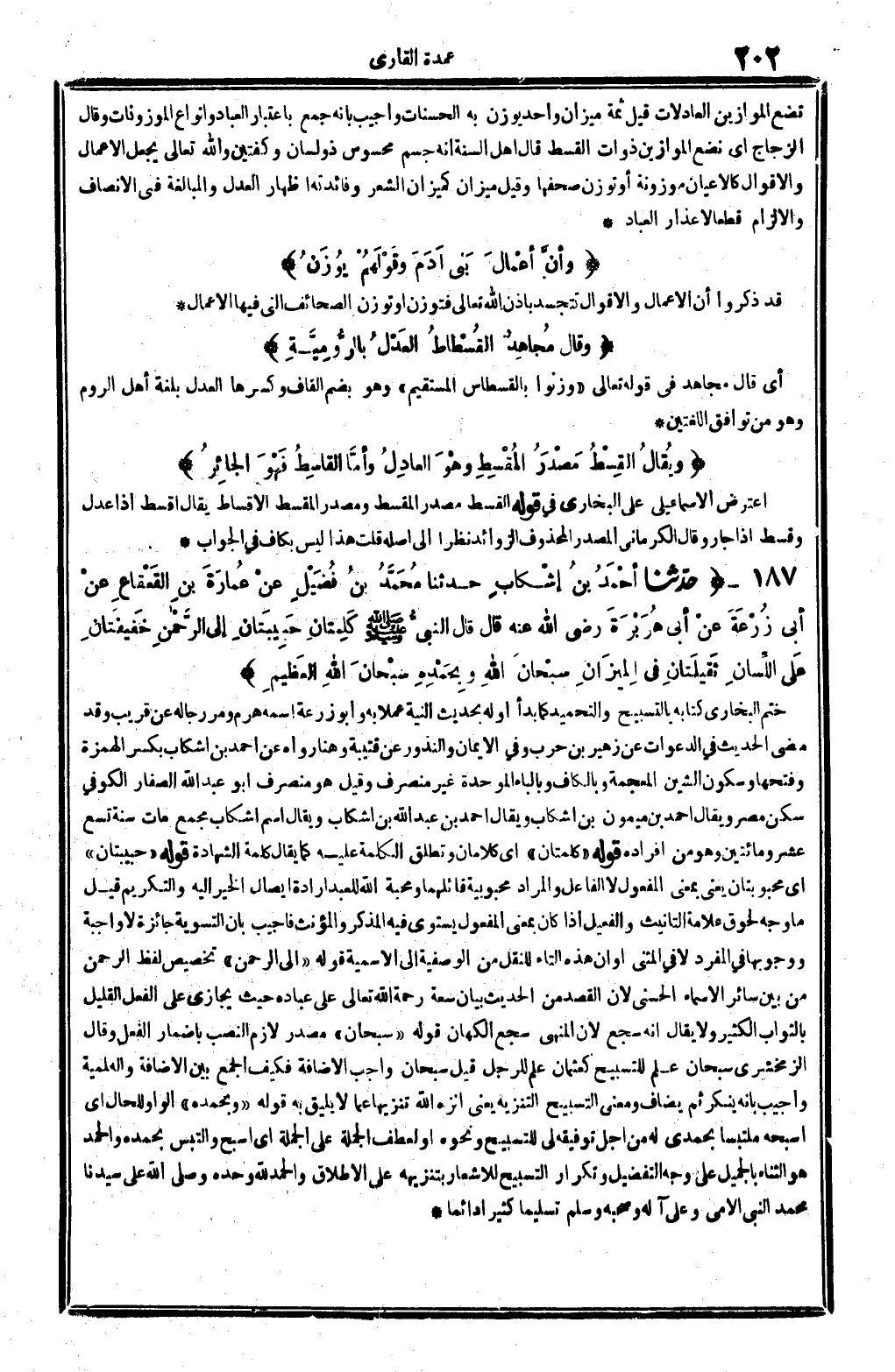 قَوْله: كلمتان أَي: كلامان، وَتطلق الْكَلِمَة عَلَيْهِ كَمَا يُقَال: كلمة الشَّهَادَة. قَوْله: حبيبتان أَي: محبوبتان يَعْنِي بِمَعْنى الْمَفْعُول لَا الْفَاعِل، وَالْمرَاد محبوبية قائلهما، ومحبة الله للْعَبد إِرَادَة إِيصَال الْخَيْر إِلَيْهِ والتكريم. قيل: مَا وَجه لُحُوق عَلامَة التَّأْنِيث؟ والفعيل إِذا كَانَ بِمَعْنى الْمَفْعُول يَسْتَوِي فِيهِ الْمُذكر والمؤنث. فَأُجِيب: بِأَن التَّسْوِيَة جَائِزَة لَا وَاجِبَة، ووجوبها فِي الْمُفْرد لَا فِي الْمثنى، أَو أَن هَذِه التَّاء للنَّقْل من الوصفية إِلَى الاسمية. قَوْله: إِلَى الرَّحْمَن تَخْصِيص لفظ الرَّحْمَن من بَين سَائِر الْأَسْمَاء الْحسنى لِأَن الْقَصْد من الحَدِيث بَيَان سَعَة رَحْمَة الله تَعَالَى على عباده، حَيْثُ يجازي على الْفِعْل الْقَلِيل بالثواب الْكثير، وَلَا يُقَال: إِنَّه سجع، لِأَن الْمنْهِي سجع الْكُهَّان. قَوْله: سُبْحَانَ مصدر لَازم النصب بإضمار الْفِعْل، وَقَالَ الزَّمَخْشَرِيّ: سُبْحَانَ علم للتسبيح كعثمان علم للرجل، قيل: سُبْحَانَ وَاجِب الْإِضَافَة فَكيف الْجمع بَين الْإِضَافَة والعلمية؟ وَأجِيب: بِأَنَّهُ يُنكر ثمَّ يُضَاف، وَمعنى التَّسْبِيح التَّنْزِيه يَعْنِي: أنزه الله تَنْزِيها عَمَّا لَا يَلِيق بِهِ. قَوْله: وَبِحَمْدِهِ الْوَاو للْحَال أَي: أسبحه ملتبساً بحمدي لَهُ من أجل توفيقه لي للتسبيح وَنَحْوه. أَو لعطف الْجُمْلَة على الْجُمْلَة أَي: أسبح وألتبس بِحَمْدِهِ، وَالْحَمْد هُوَ الثَّنَاء بالجميل على وَجه التَّفْضِيل، وتكرار التَّسْبِيح للإشعار بتنزيهه على الْإِطْلَاق، وَالْحَمْد لله وَحده، وَصلى الله على سيدنَا مُحَمَّد النَّبِي الْأُمِّي وعَلى آله وَصَحبه وَسلم تَسْلِيمًا كثيرا دَائِما.