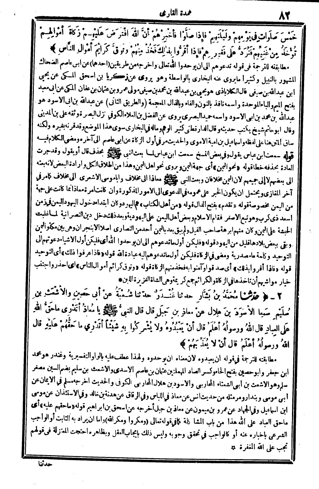 حدّثنا مُحَمَّدُ بنُ بَشَّارٍ، حَدثنَا غُنْدَرٌ، حدّثنا شُعْبَةُ عنْ أبي حَصِينٍ والأشْعَثِ بنِ سُلَيْمٍ سَمِعا الأسْوَدَ بنَ هِلال، عنْ معاذِ بنِ جَبَلٍ قَالَ: قَالَ النبيُّ يَا مُعاذُ أتَدْرِي مَا حَقُّ الله عَلى العِبادِ؟ قَالَ: الله ورسولُهُ أعْلَمُ. قَالَ: أنْ يَعْبُدُوهُ وَلَا يُشْرِكُوا بِهِ شَيْئاً، أتَدْرِي مَا حَقُّهُمْ عَلَيْهِ؟ قَالَ: الله ورسولُهُ أعْلَمُ. قَالَ: أنْ لَا يُعَذِّبَهُمْ.