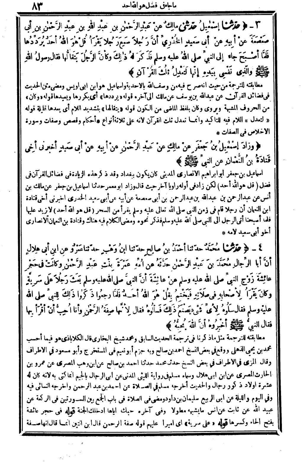 7374 - حدّثنا إسْماعِيلُ، حدّثني مالِكٌ عنْ عَبْدِ الرَّحْمانِ بنِ عَبْدِ الله بنِ عَبْدِ الرَّحْمانِ بنِ أبي صَعْصَعَة عنْ أبِيهِ، عنْ أبي سَعيدٍ الخُدْرِيِّ أنَّ رَجُلاً سَمِعَ رَجُلاً يَقْرأُ: {قُلْ هُوَ اللَّهُ أَحَدٌ} يُرَدِّدُها فَلمَّا أصْبَحَ جاءَ إِلَى النبيِّ فَذَكَرَ لهُ ذالِكَ وكأنَّ الرَّجُلَ يَتقالُّها، فَقَالَ رسولُ الله والّذِي نَفْسِي بِيَدِهِ، إنّها لَتَعْدِلُ ثُلثَ القُرآنِ